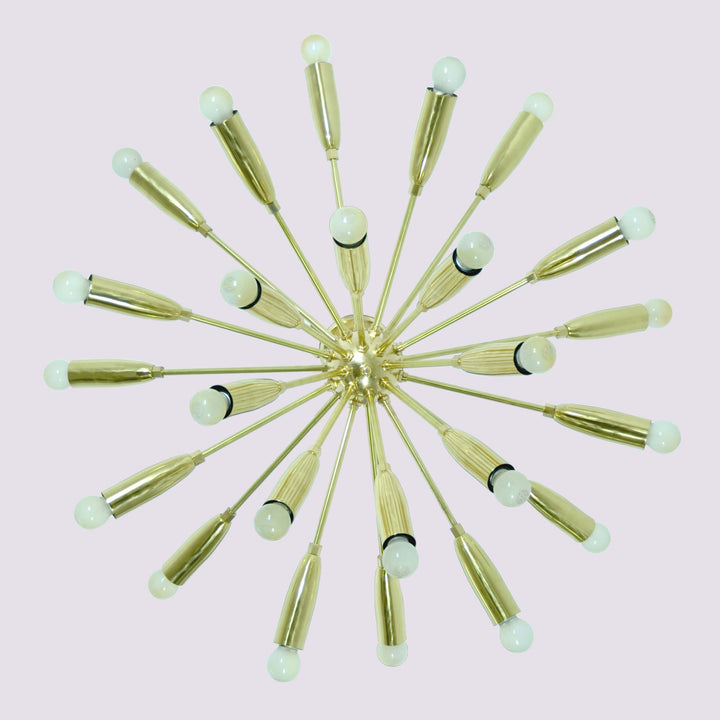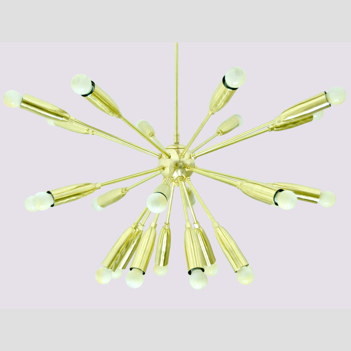 This striking 24-arm Sputnik chandelier is a true statement piece, blending mid-century modern flair with industrial elegance. Featuring a radiant brass finish, each meticulously crafted arm extends outward like a celestial burst, crowned with glowing bulbs that cast a soft, ambient light. The chandelier’s symmetrical silhouette create a stunning focal point—perfect for elevating living rooms, dining areas, bedrooms, offices, or boutique interiors. Its fusion of modern geometry and warm vintage charm makes it ideal for both minimalist lofts and eclectic spaces. Whether suspended in a high-ceiling foyer or above a contemporary dining table, this chandelier transforms your interior into a curated, design-forward environment.
