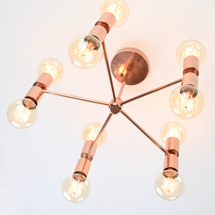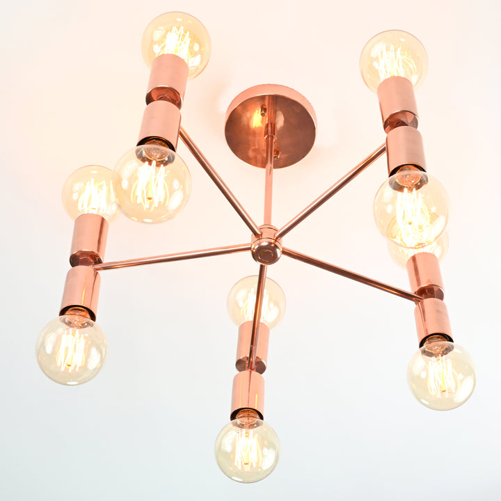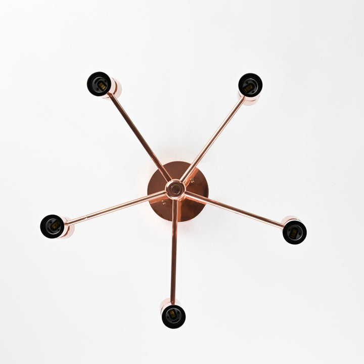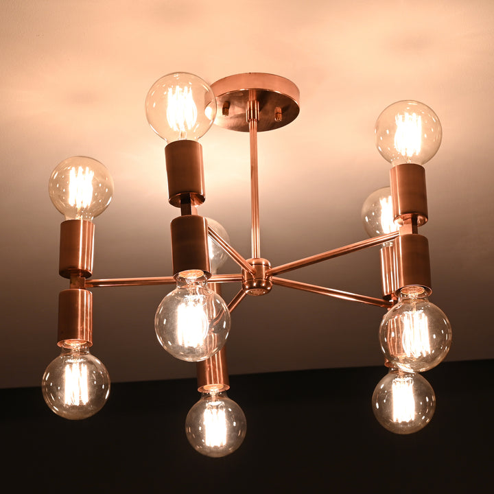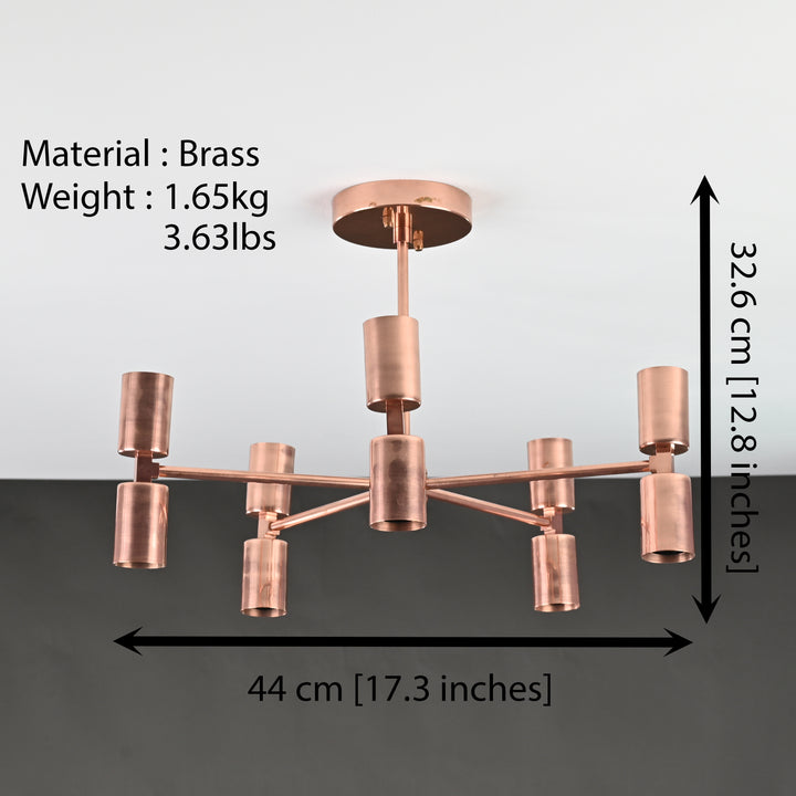 This modern brass ceiling light fixture features a sleek and elegant design with five arms, each holding two light sockets, making a total of ten lights. The structure showcases chrome finish that adds a touch of sophistication to any space. With dimensions of 44 cm (17.3 inches) in width and 32.6 cm (12.8 inches) in height, this fixture is ideal for contemporary interiors seeking a stylish and warm lighting solution. Its geometric design and clean lines make it a standout piece in dining rooms, living areas, or entryways.