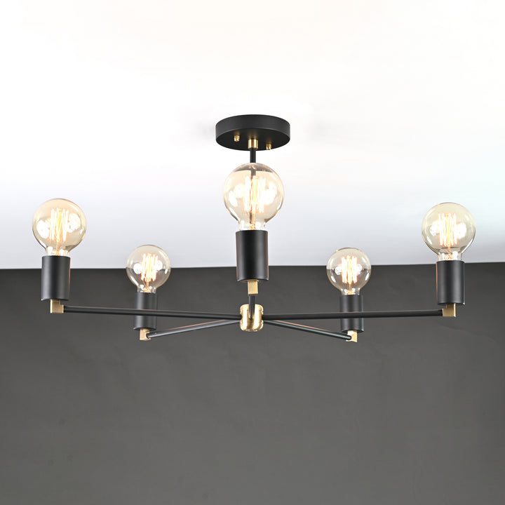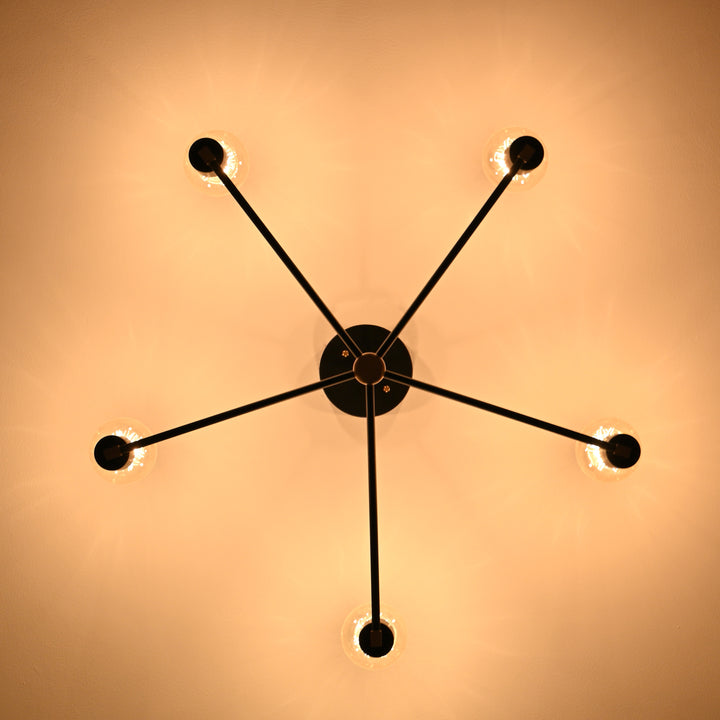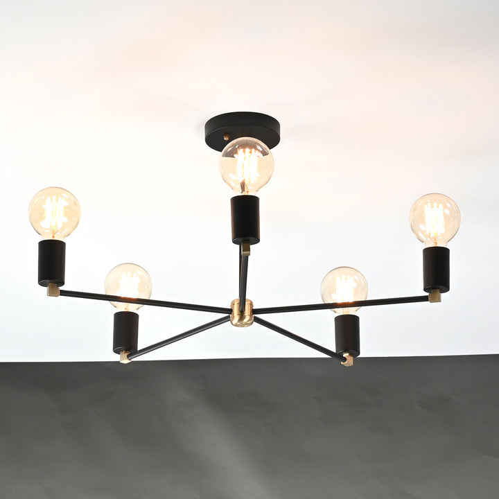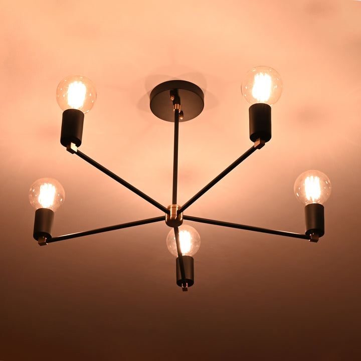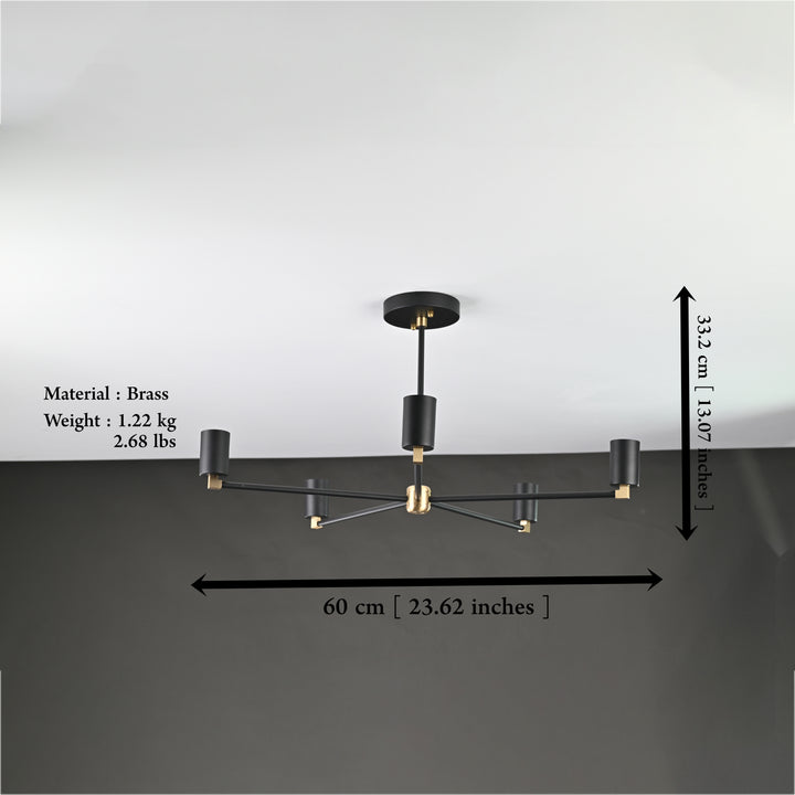 This contemporary ceiling light fixture exudes sophistication with its sleek, minimalist design crafted from high-quality brass, accented in matte black and gold finishes. Measuring 60 cm (23.62 inches) in width and extending 33.2 cm (13.07 inches) from the ceiling, it makes a striking yet balanced statement in any modern interior. Designed with five evenly spaced light holders, the fixture offers both aesthetic symmetry and optimal illumination. Ideal for living rooms, dining areas, or stylish office spaces, this piece effortlessly combines refined elegance with functional brilliance.