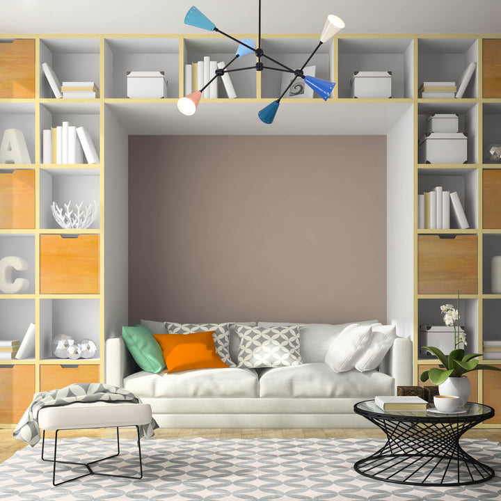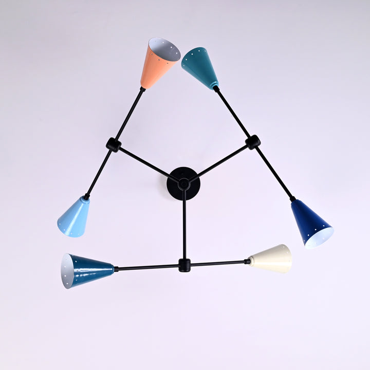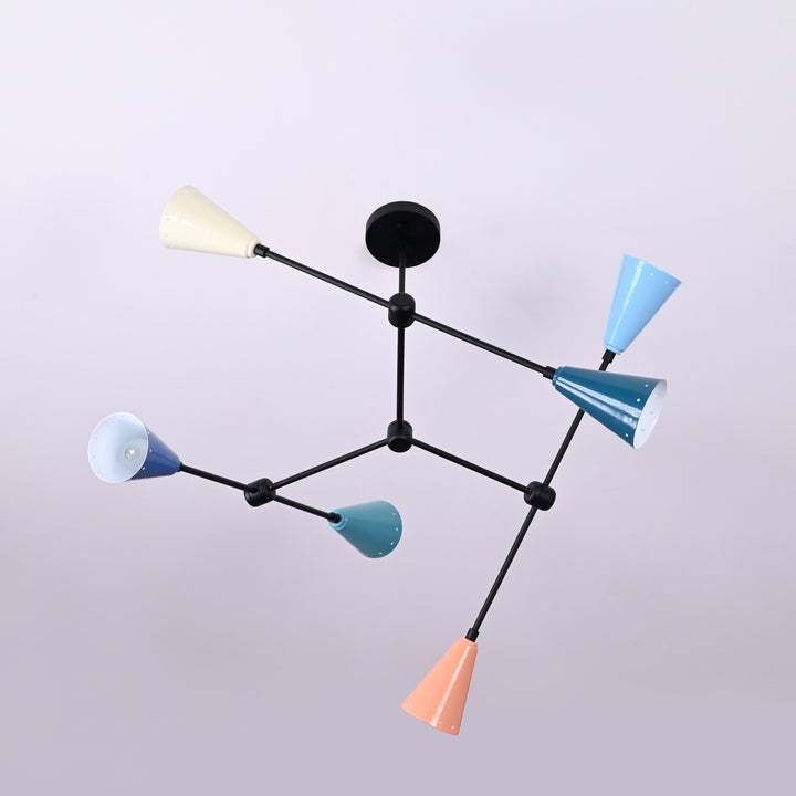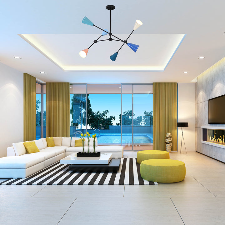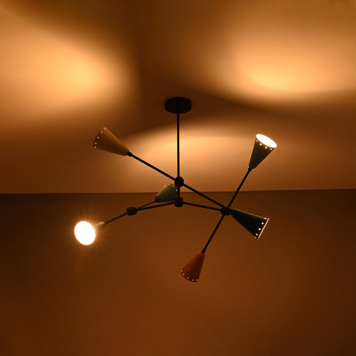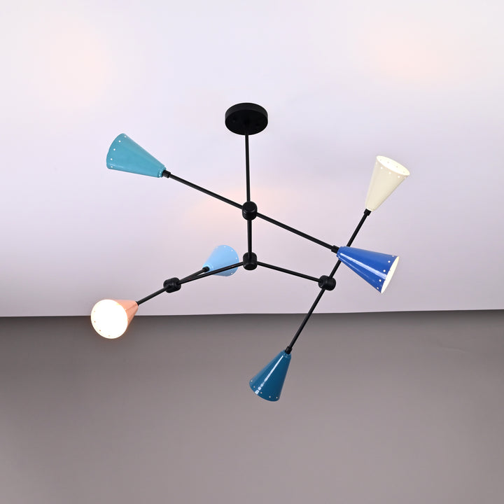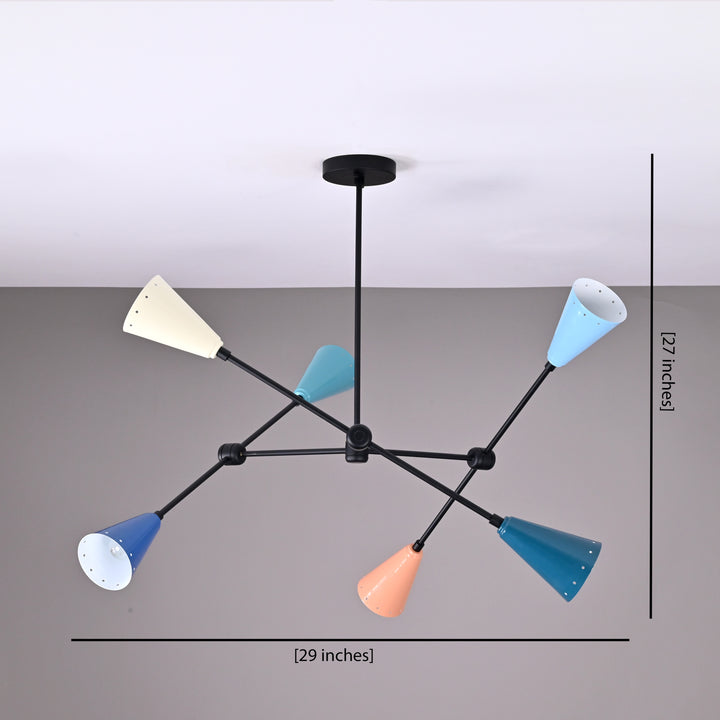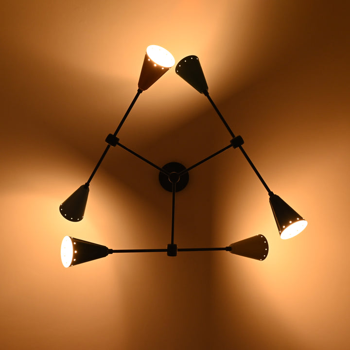 This ceiling-mounted light fixture features a modern, sculptural design with six angled arms extending from a central hub. Each arm holds a cone-shaped shade, arranged to create visual balance and spread light effectively. Measuring 29 inches in width and 27 inches in height, it suits medium to large spaces with standard or high ceilings. In dark settings, the fixture casts a warm, ambient glow, enhancing the room’s atmosphere with soft, diffused lighting. Its structure ensures multi-directional illumination, minimizing shadows and adding depth. The design blends functionality with striking form, making it ideal for contemporary interiors.