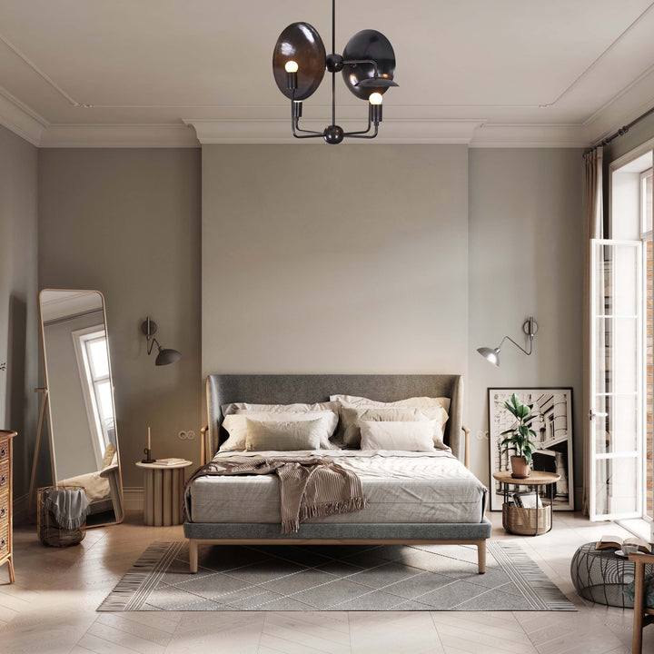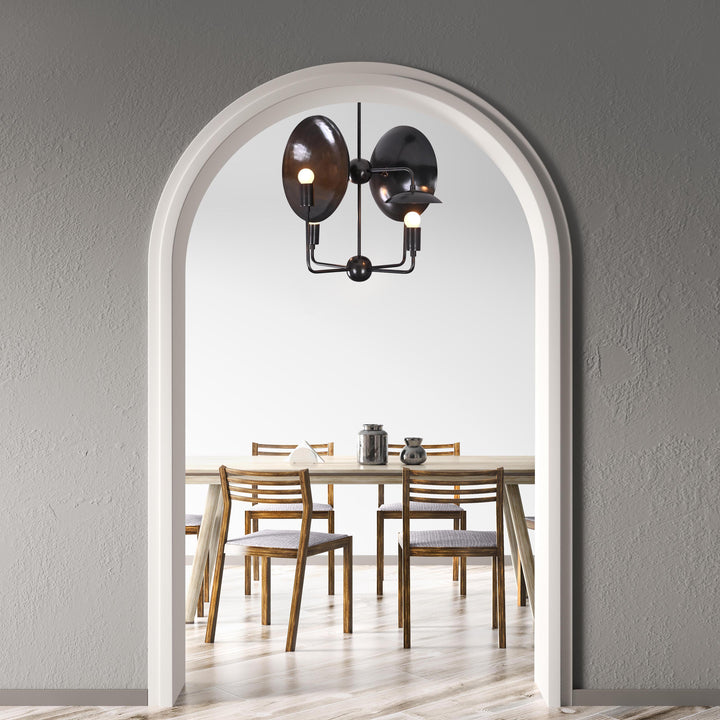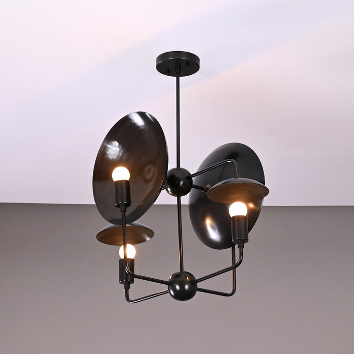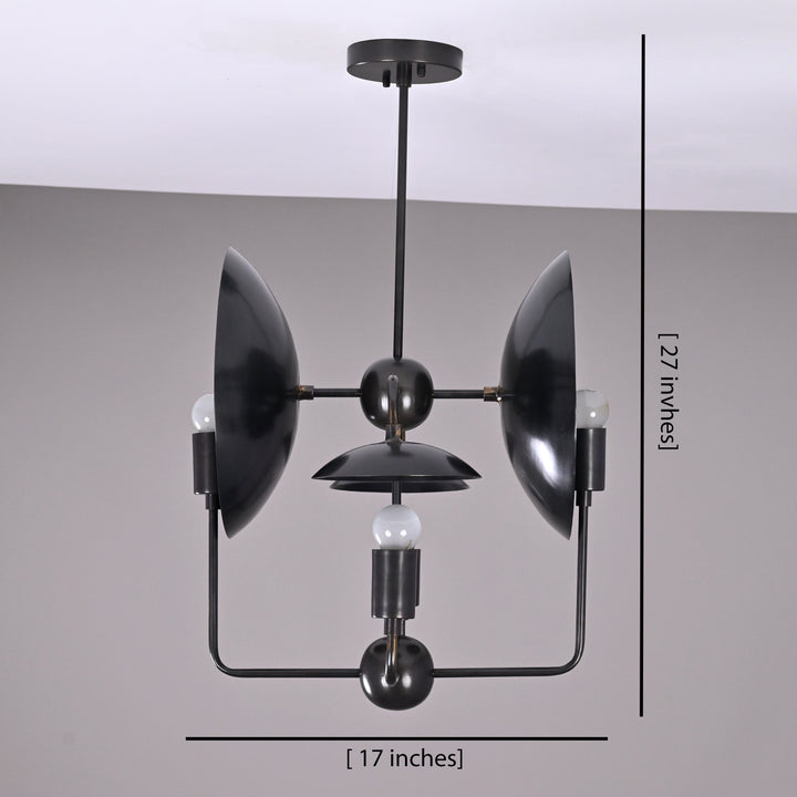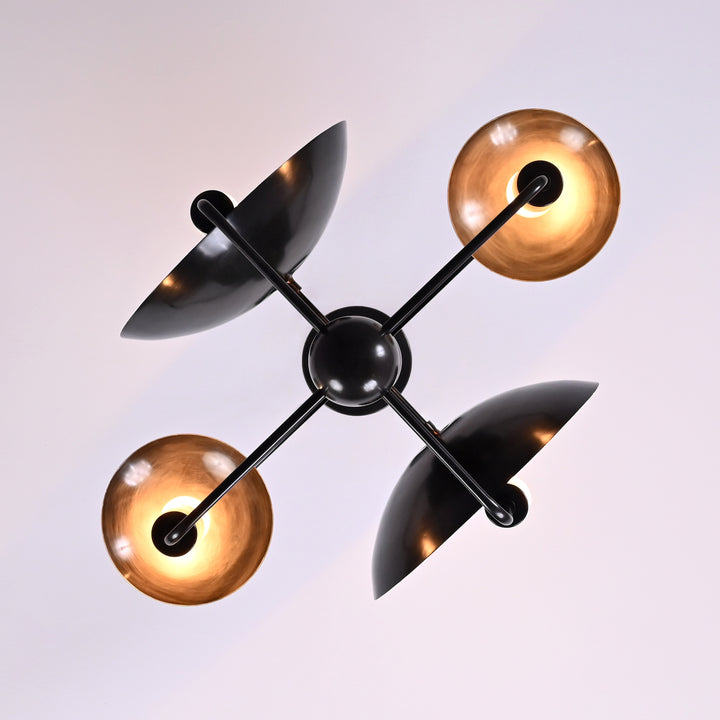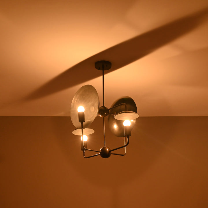 This ceiling light fixture features a unique, geometric design with four evenly spaced bulb holders arranged around a central sphere. It integrates curved, dish-like reflectors behind each bulb to enhance light distribution and visual interest. The structure is supported by a single vertical rod attached to a ceiling mount, ensuring a balanced and sturdy installation. Measuring 27 inches in height and 17 inches in width, this light is ideal for mid-sized to large rooms. When illuminated in a dark room, it casts dramatic, artistic shadows and a warm ambient glow that enhances the atmosphere. The layout ensures that the light is distributed evenly while also creating a striking visual effect. Its contemporary structure blends modern aesthetics with functional lighting, making it a statement piece.