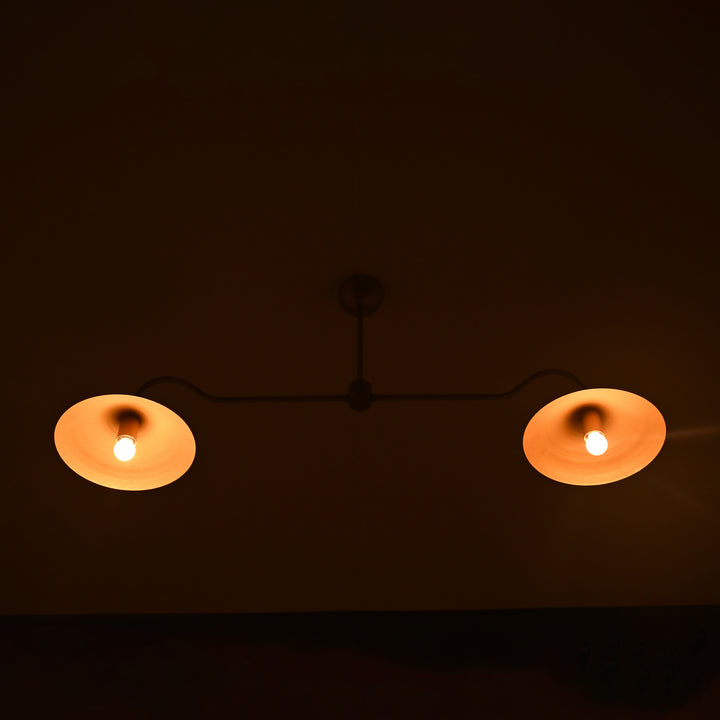 This ceiling-mounted lighting fixture features a balanced, linear design with two individual light sources branching out symmetrically from a central rod. The structure is thoughtfully engineered, combining functional elegance with a modern aesthetic. When illuminated, it casts a warm, ambient glow that enhances the atmosphere, especially in dimly lit or dark rooms. The fixture extends to a width of 51 inches and drops 22 inches from the ceiling, offering an ideal scale for dining areas, living rooms, or workspaces. The dual light configuration ensures even illumination across a broad area. From both side and bottom views, the alignment and proportional design highlight its structural symmetry. This piece brings both form and function into a single refined element, making it suitable for contemporary interiors.