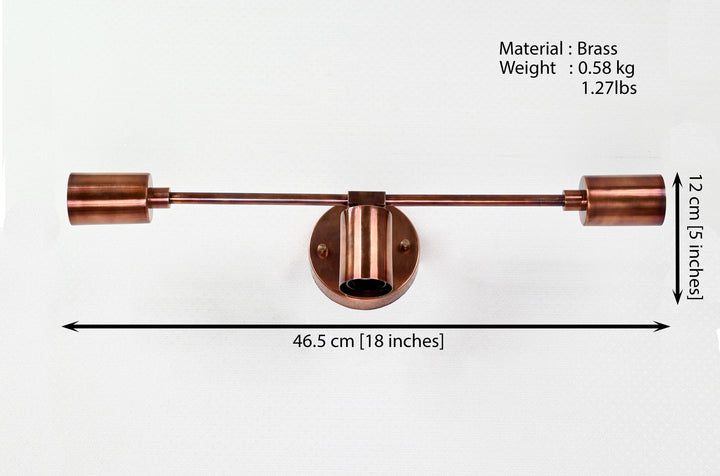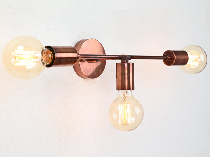 Striking a perfect balance between utility and style, this three-light wall sconce is crafted from solid brass and finished in a rich copper tone. Measuring 46.5 cm (18 inches) in width and 12 cm (5 inches) in height, the fixture features a clean linear form with two horizontal cylindrical bulb holders flanking a central vertical socket. The design offers multidirectional illumination—casting light both outward and downward—ideal for layering brightness across vanity spaces or accent walls. Weighing just 0.58 kg (1.27 lbs), this lightweight fixture is simple to install while offering substantial visual impact. Its brushed copper finish adds a touch of vintage elegance with a modern sensibility, making it a perfect fit for transitional interiors or retro-modern themes. When fitted with Edison or round globe bulbs, the sconce glows warmly, enhancing the fixture’s sculptural form and metallic luster.