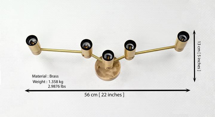Crafted from solid brass, this striking five-light wall sconce stands out with its unique angular arm layout, forming a subtle V-shaped silhouette that offers modern geometric appeal. Measuring 56 cm (22 inches) in width and 13 cm (5 inches) in height, it makes a bold yet balanced statement on any wall. The brushed brass finish infuses a sense of warmth and luxury, while the five individual bulb holders ensure bright, even illumination. Perfect for placement above mirrors, along hallways, or in creative interiors that welcome sculptural lighting, this fixture combines style with functionality. Pair it with exposed filament bulbs for vintage charm or frosted globes for a softer modern glow.