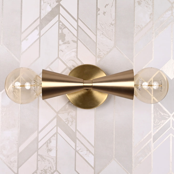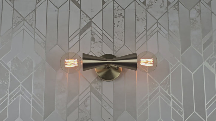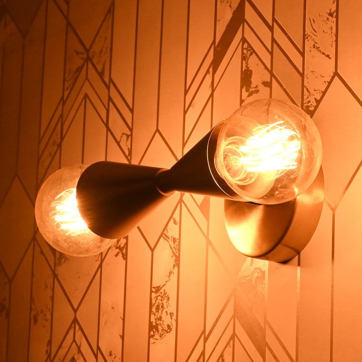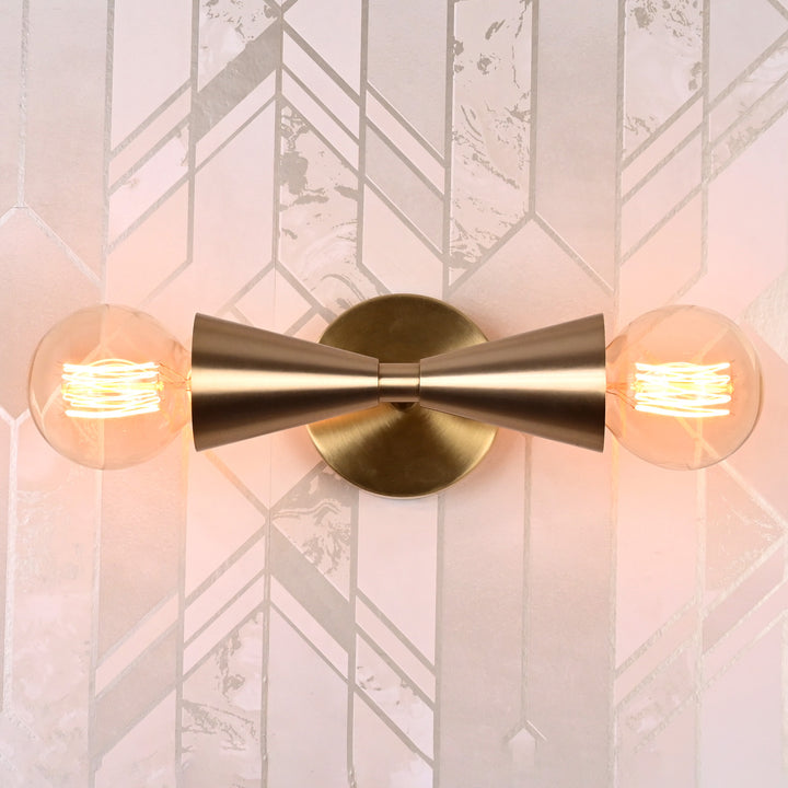 This sleek double-cone wall sconce delivers a modern twist on mid-century aesthetics. Measuring 8 inches in width and 4 inches in height, the fixture features a symmetrical brass structure that gracefully balances form and function. Its warm, brushed brass finish infuses the piece with a sense of understated luxury, making it an elegant addition to any interior space. Designed with versatility in mind, this sconce is ideal for flanking mirrors, illuminating corridors, or accenting entryways. The exposed bulb design invites ambient illumination while adding a touch of industrial flair to its otherwise streamlined silhouette.
