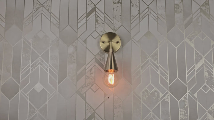 Compact yet captivating, this cone-shaped wall sconce in brushed gold brings a warm, contemporary touch to any space. Measuring 5 inches tall and extending 4 inches wide, this piece blends utility with elegance. The sleek cone shade directs light downward, making it ideal for task lighting or as a stylish accent. Mounted on a circular backplate with a graceful curved arm, it softly illuminates with a minimalist glow that enhances modern interiors without overwhelming the space. The brass finish lends a timeless appeal, while the overall form feels fresh and refined. Whether used as a pair beside a mirror or lining a hallway, this fixture is perfect for design lovers seeking simplicity with a luxe edge.
