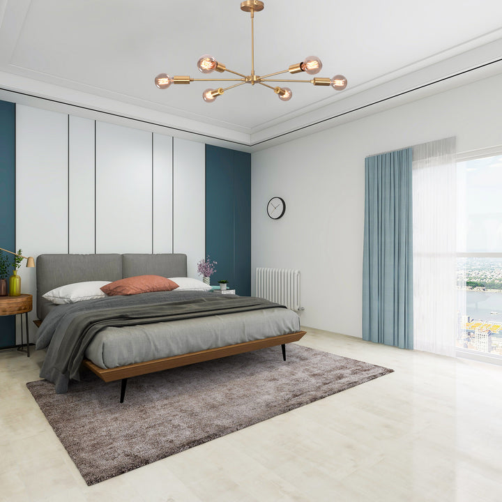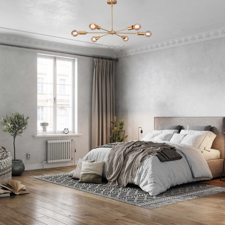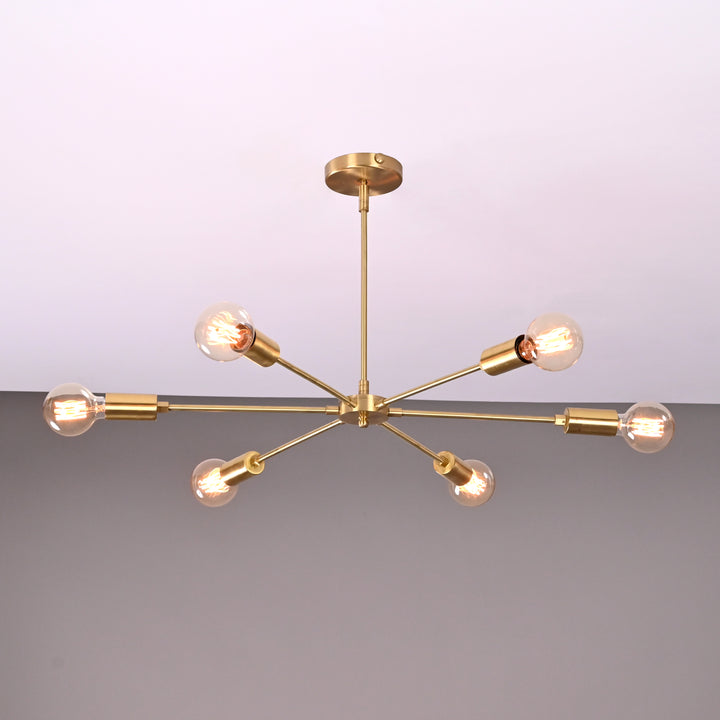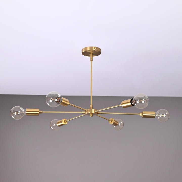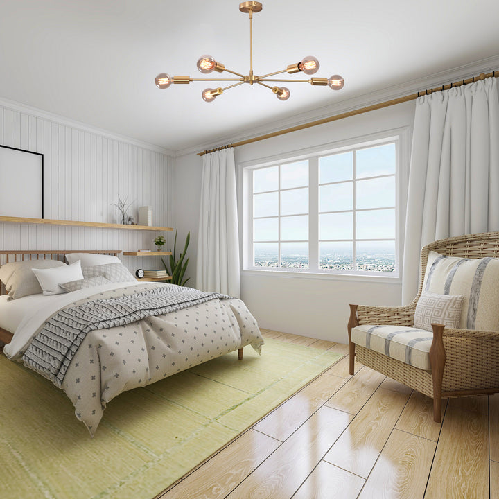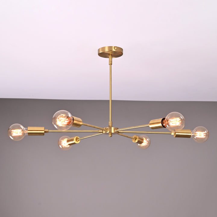 This modern chandelier features a striking six-arm design, radiating style and function in equal measure. Measuring 31 inches in width and 17 inches in height, it offers a balanced profile ideal for dining rooms, living areas, or entryways. The fixture accommodates six bulbs, arranged in a symmetrical starburst pattern, creating an even and warm illumination that enhances any interior setting. Its sleek construction and minimalist lines make it a versatile choice for contemporary décor.