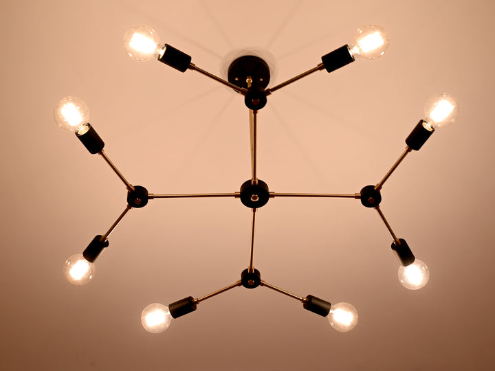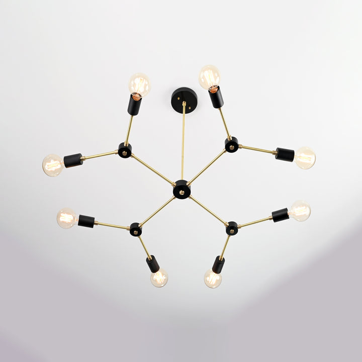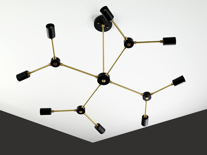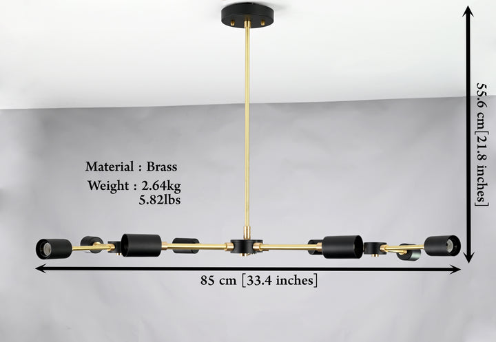 Elevate your interior with this sophisticated ceiling light fixture, meticulously crafted from premium brass. Featuring a refined interplay of brushed brass and matte black finishes, its sleek, contemporary form adds a bold statement to any modern living space. With a width of 85 cm (33.4 inches) and a drop of 55.6 cm (21.8 inches), it strikes the perfect balance between elegance and architectural presence. Designed to captivate, the fixture boasts 8 radiant lights arranged in a dynamic, geometric composition that casts ambient illumination with artistic flair. Ideal for upscale dining areas, stylish living rooms, or creative workspaces, this piece effortlessly fuses functionality with avant-garde design, transforming any ceiling into a focal point of timeless sophistication.