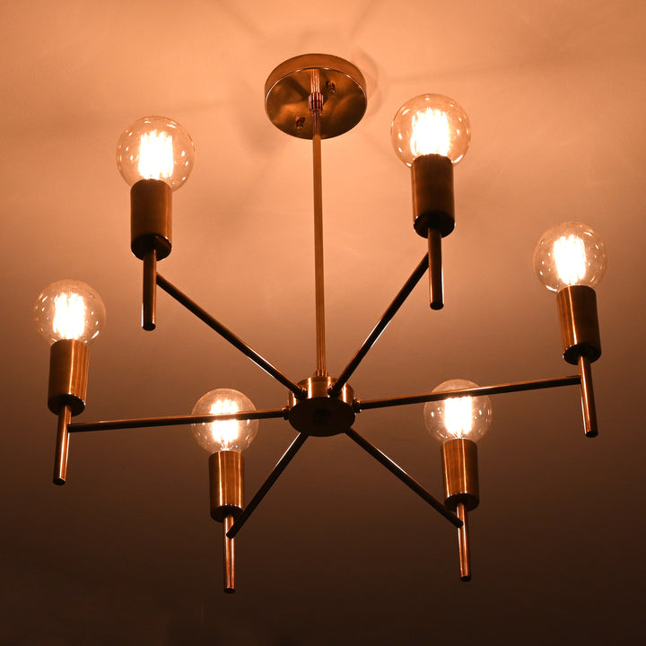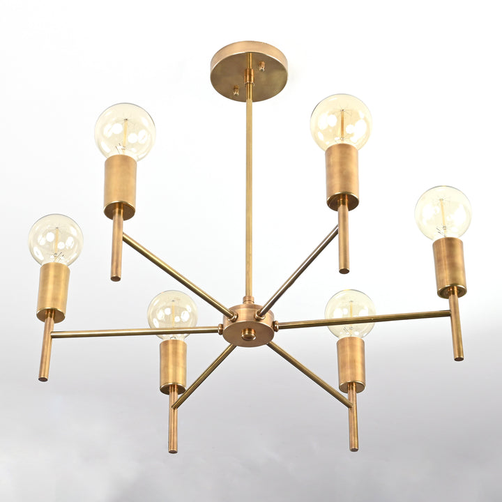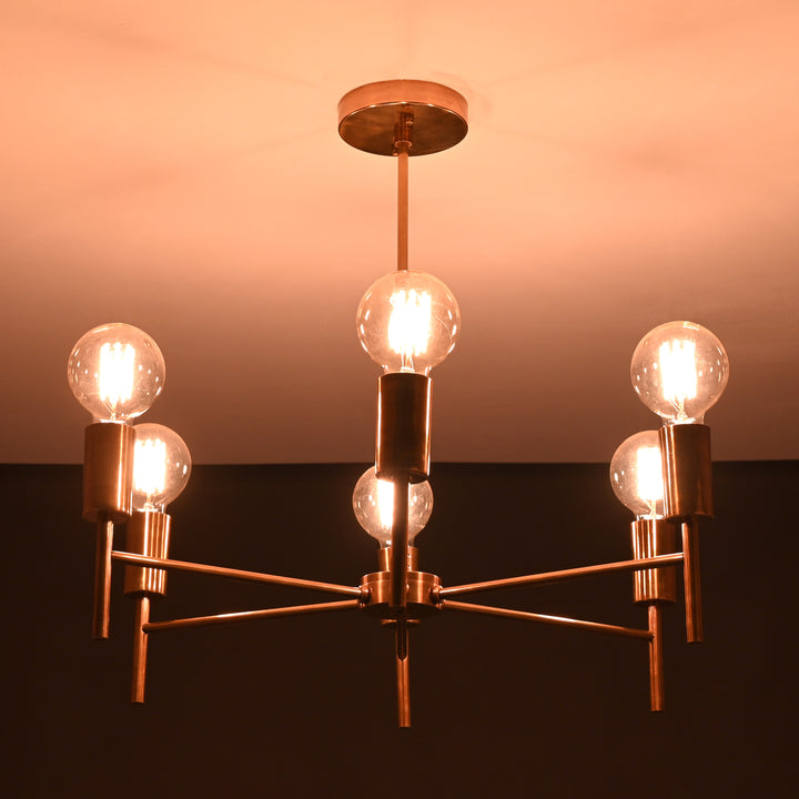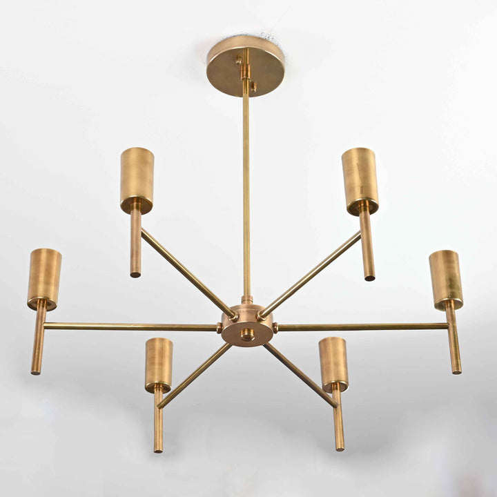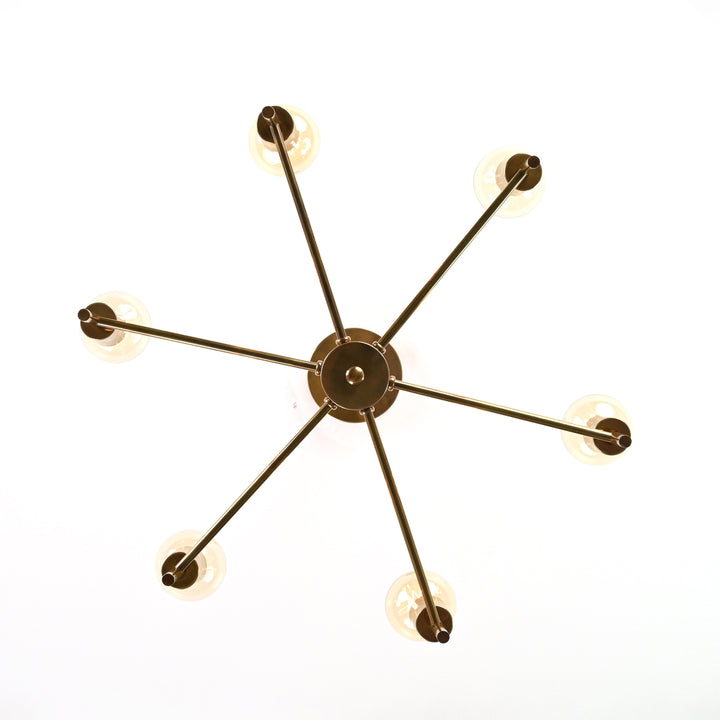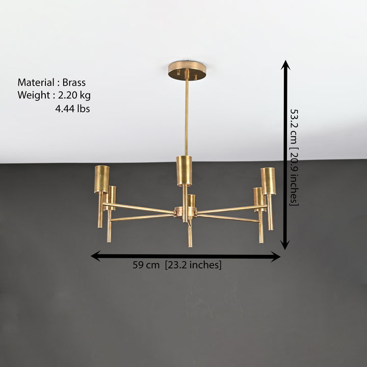 This sophisticated ceiling chandelier is expertly crafted from solid brass in an antique finish, offering a striking blend of modern elegance and vintage charm. Measuring 59 cm (23.2 inches) in width and 53.2 cm (20.9 inches) in height, it is designed to create a bold yet balanced visual impact. The fixture features six gracefully extended arms, each supporting a light, arranged in a symmetrical formation that enhances its refined silhouette. Perfect for contemporary and classic interiors alike, this chandelier serves as both a functional light source and a statement piece, enriching any space with its warm, architectural presence.