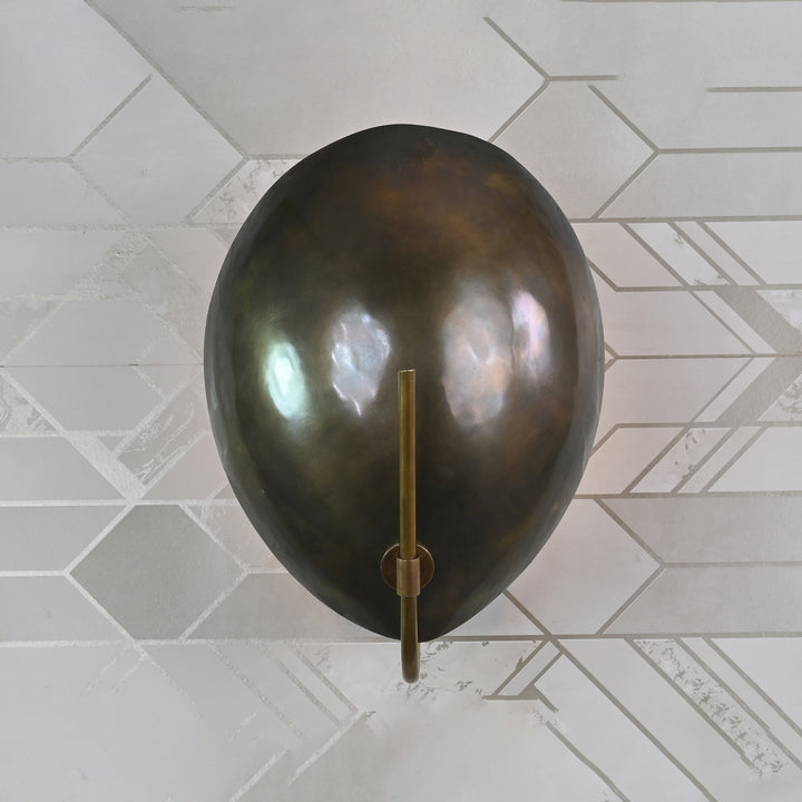 Evoke a sense of organic elegance and sculptural refinement with this distinctive handcrafted brass wall sconce. Shaped like an abstracted leaf or shield, the oversized, concave shade is a celebration of form and materiality—measuring 32.5 cm (13 inches) in height and 24 cm (10 inches) in width. Its hammered, oxidized finish showcases rich earthy tones that shift with the light, giving it a patinated, antiquarian quality. The curved brass arm and minimalist mounting plate allow the dramatic form to seemingly float against the wall, creating an interplay of light, shadow, and depth. This piece offers both illumination and artistry—an ideal choice for statement-making hallways, curated entryways, or as a standalone art light in sophisticated interiors.