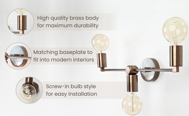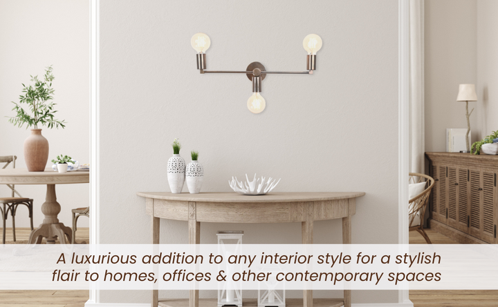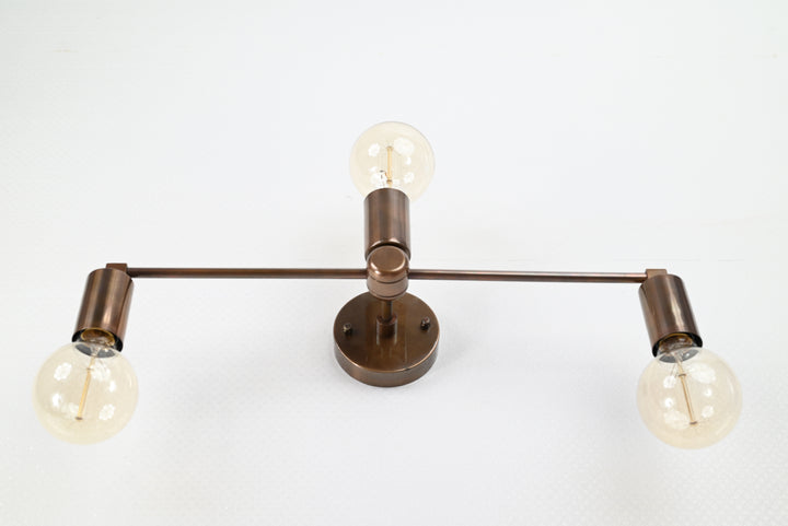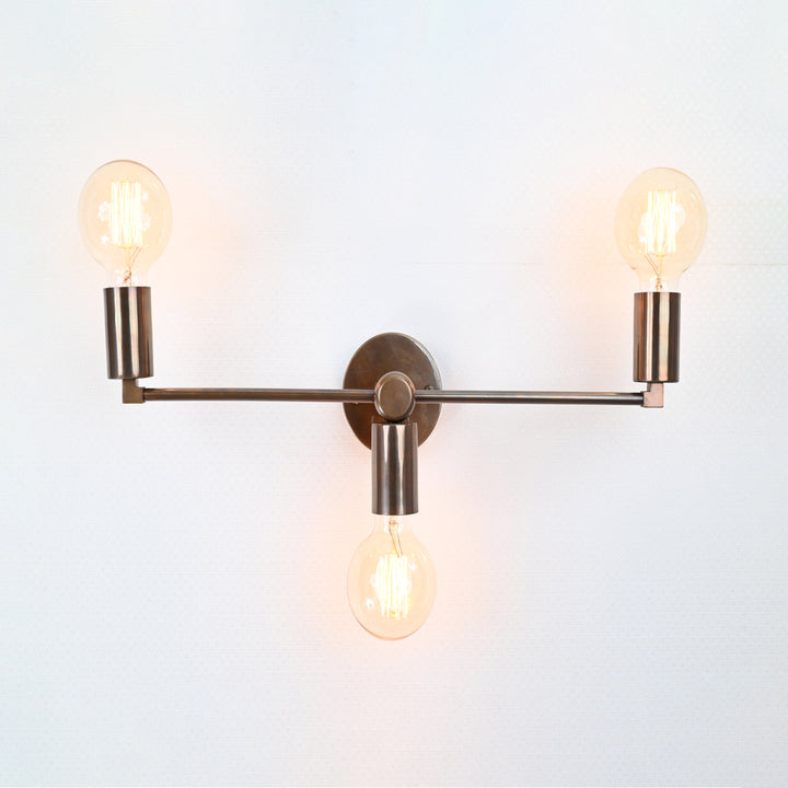 This distinctive wall sconce embodies refined minimalism with a bold architectural presence. Expertly crafted from premium brass, it features a symmetrical triple-light design with a streamlined horizontal bar and cylindrical sockets that radiate from a central mount. The brushed brass finish offers a warm, lustrous patina that enhances its modern-industrial character, while its clean geometry creates a sense of visual balance and sophistication. Measuring 50.8 cm (20 inches) in width and 15.3 cm (6 inches) in height, this sculptural piece makes a striking yet subtle statement—ideal for spaces with contemporary, transitional, or mid-century influences. Whether installed above a vanity, along a hallway, or as accent lighting in a living area, this fixture delivers soft, ambient illumination while elevating the overall design narrative of the room. A masterful blend of form and function, this sconce transforms everyday lighting into a curated experience of modern craftsmanship.