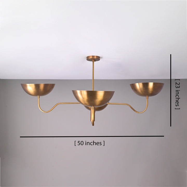 This ceiling light fixture features a striking, modern structure with four upward-facing bowl-shaped holders, each housing a single bulb. The balanced arms extend symmetrically from the central rod, creating a sculptural presence that adds depth and elegance to any room. Designed to offer an uplifting glow, the bowls reflect light toward the ceiling, diffusing a soft, ambient radiance. When illuminated in a dark room, it creates a warm, atmospheric halo that enhances the mood and highlights the fixture’s artistic form. Measuring 50 inches in width and 23 inches in height, it’s ideal for spacious interiors where design meets function seamlessly.