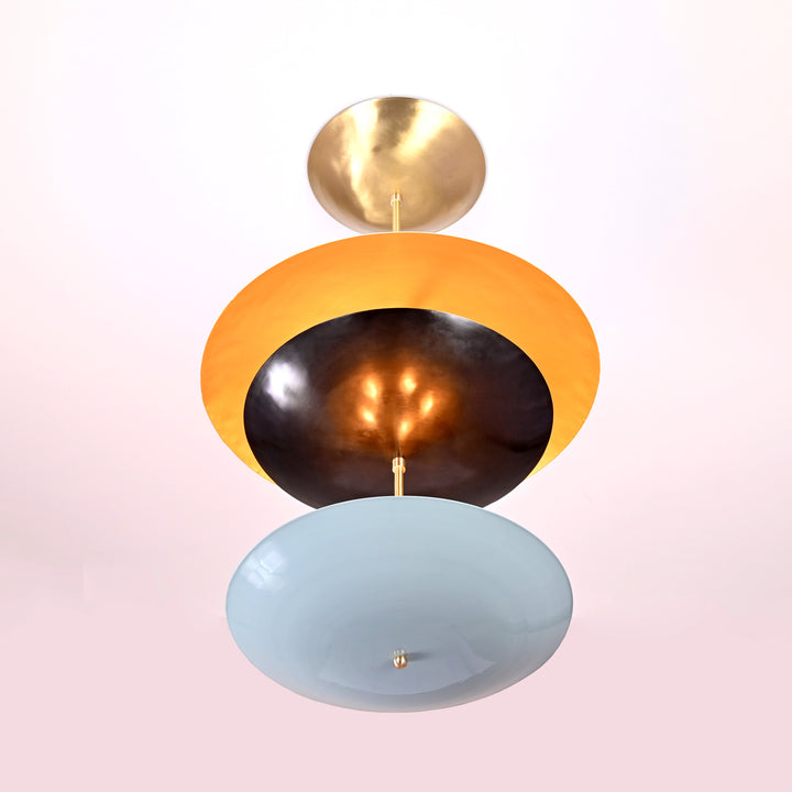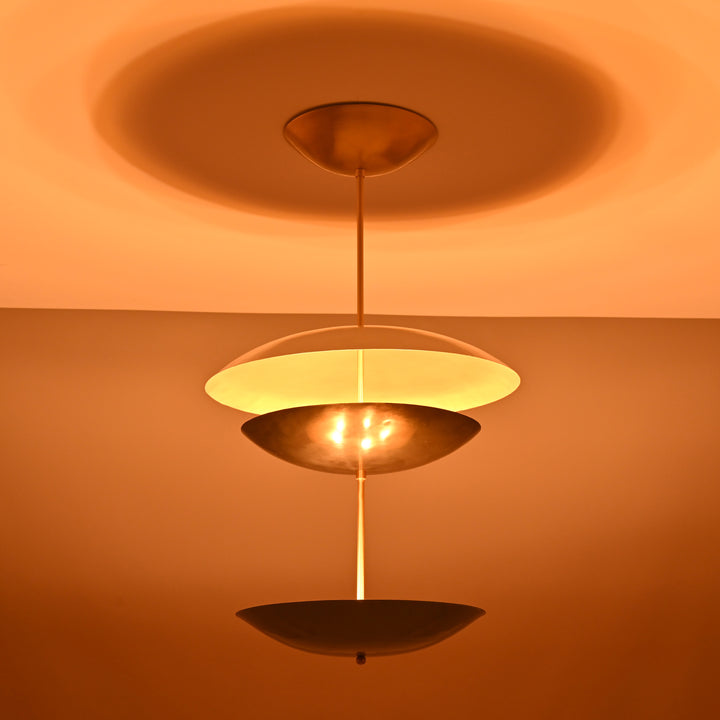 This chandelier features a sophisticated structure with three gracefully layered discs designed to create a dramatic play of indirect light. It houses a total of 10 bulbs, thoughtfully placed to enhance the ambient glow without exposing the light source directly. When illuminated in a dark room, the chandelier casts a warm, soft radiance with elegant reflections and layered shadow patterns on the ceiling. Measuring 24 inches in width and 32 inches in height, it makes a bold yet refined statement, perfectly balancing form and function. Its sculptural silhouette transforms both day and night with a seamless blend of light and architectural beauty.