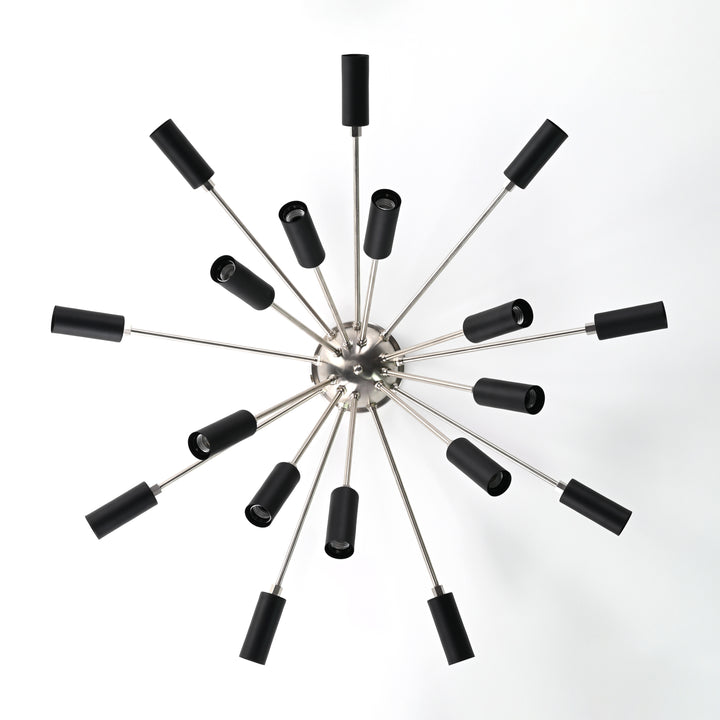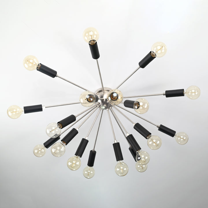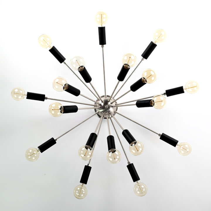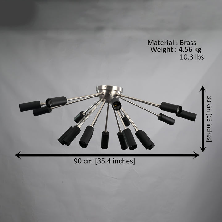 This exquisite flush mount lamp showcases a striking starburst silhouette, embodying a perfect fusion of mid-century flair and modern elegance. Designed with 18 evenly radiating arms, each outfitted with a sleek black socket, the fixture forms a captivating visual reminiscent of a celestial explosion. Expertly crafted from premium brass, it boasts both durability and sophistication. With a commanding diameter of 90 cm (35.4 inches) and a height of 33 cm (13 inches), this starburst flush mount light serves as a bold architectural statement while maintaining a low-profile presence—ideal for rooms with standard ceiling heights. A true testament to refined design, it transforms any space into a gallery of contemporary style.
