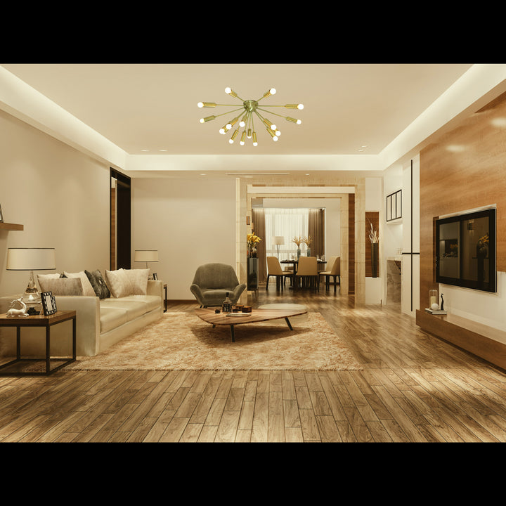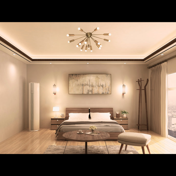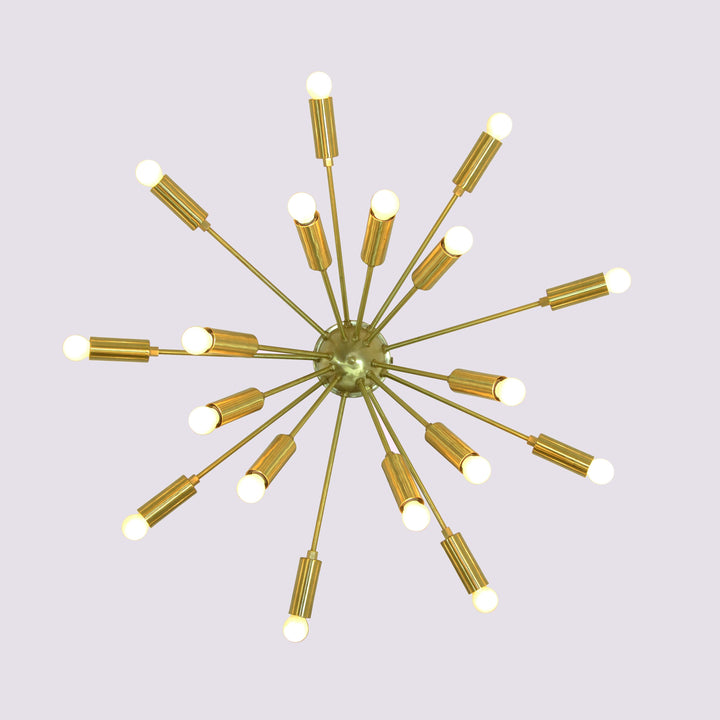 This image showcases a stunning flush mount chandelier that exudes modern elegance and timeless industrial charm. Crafted with precision, it features a radiant brass finish that instantly elevates any interior with a luxurious yet inviting ambiance. Its starburst-inspired structure radiates energy and sophistication, making it not just a source of light but a bold statement piece. With 18 gracefully extended arms, each tipped with a cylindrical brass socket and a soft-glow bulb, this chandelier delivers balanced illumination and sculptural beauty. The symmetrical arrangement provides a striking visual appeal from every angle, creating an effortlessly stylish centerpiece ideal for a variety of spaces—from minimalist urban lofts to eclectic designer interiors. Its flush mount design allows for easy installation even in rooms with lower ceilings, offering the perfect blend of form and function. This piece beautifully bridges vintage influence with contemporary aesthetics, casting a warm, diffused glow that enhances the atmosphere of living rooms, dining areas, bedrooms, offices, or boutique-style environments.