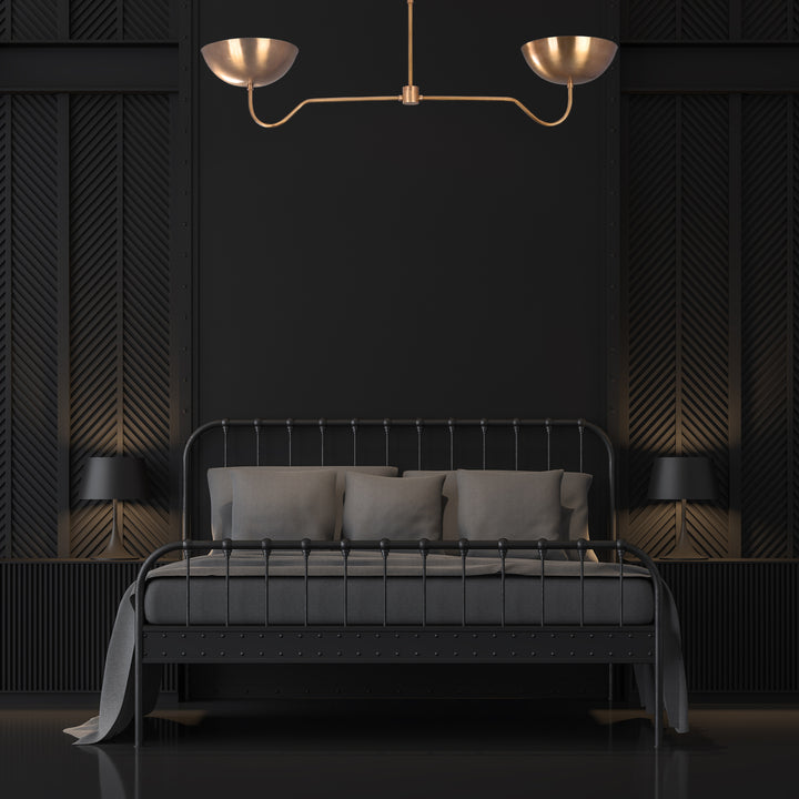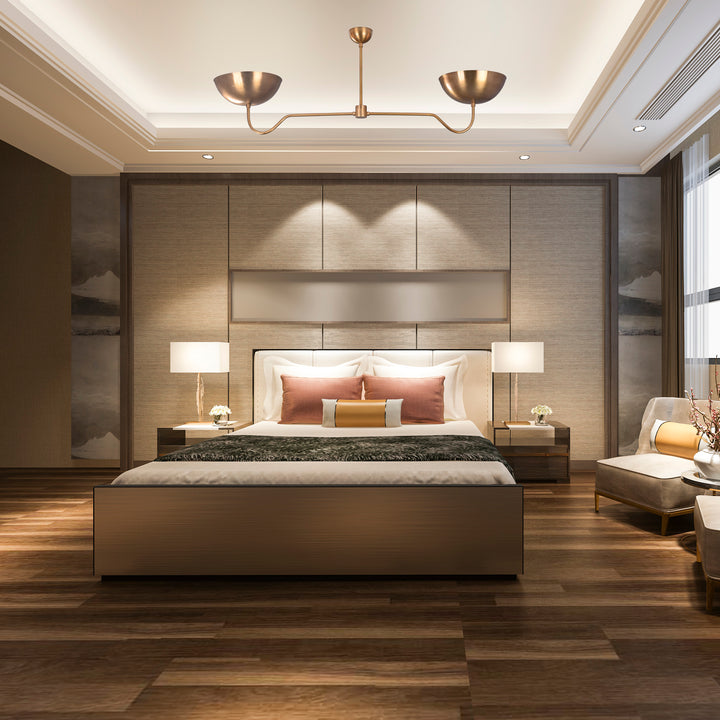 Designed with a sleek, suspended structure, this ceiling light features two upward-facing bowls that deliver an elegant balance of form and function. Measuring 51 inches in width and extending 18 inches from the ceiling, the design showcases a clean, minimal profile with a gentle curvature in its arms. It accommodates two bulbs, providing soft, uplifting illumination that reflects off the ceiling, enhancing ambient lighting. In a dark room, the fixture creates a warm and even glow with a visually striking halo effect above each bowl, contributing to a cozy and elegant atmosphere.