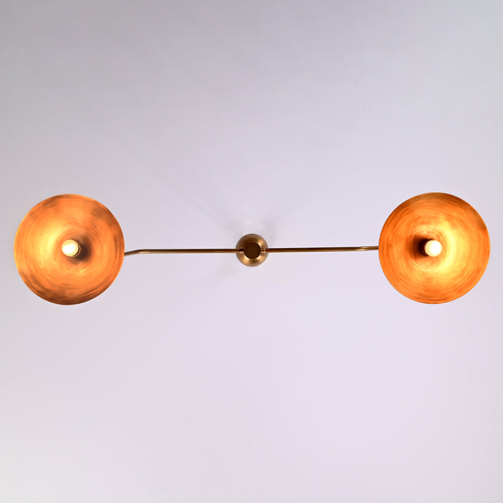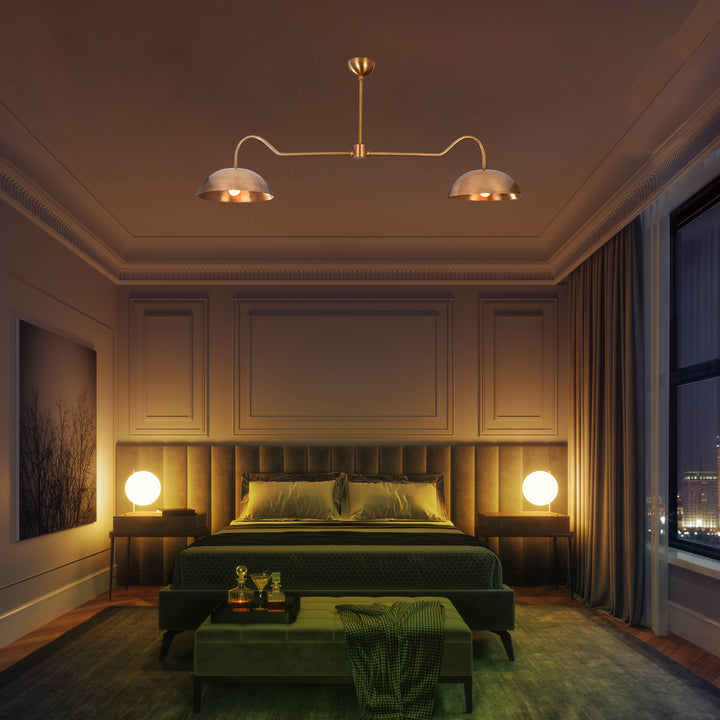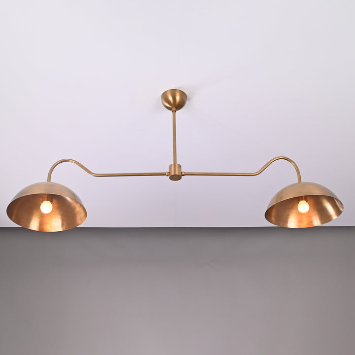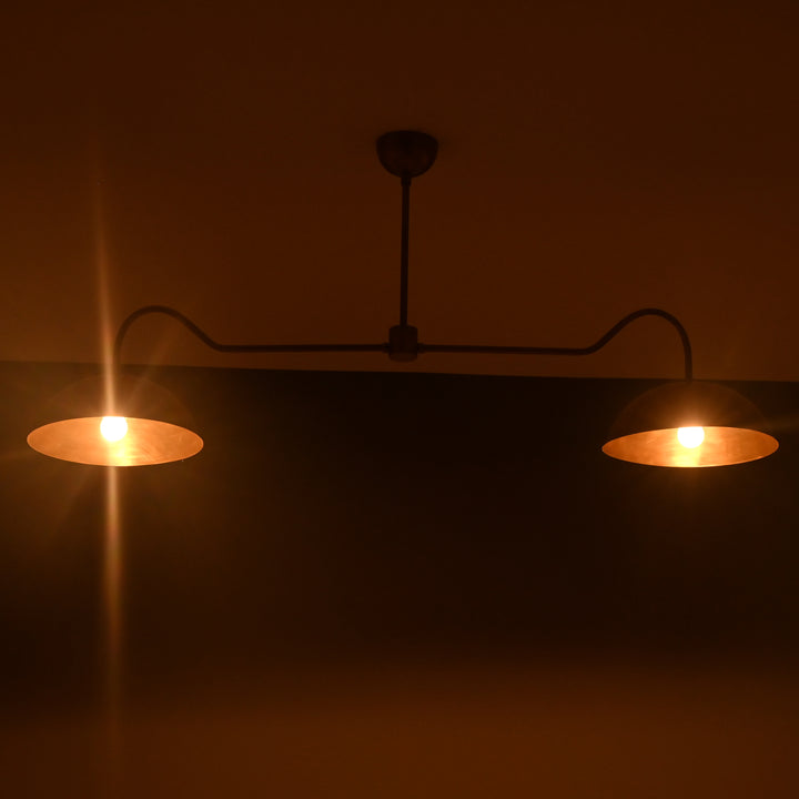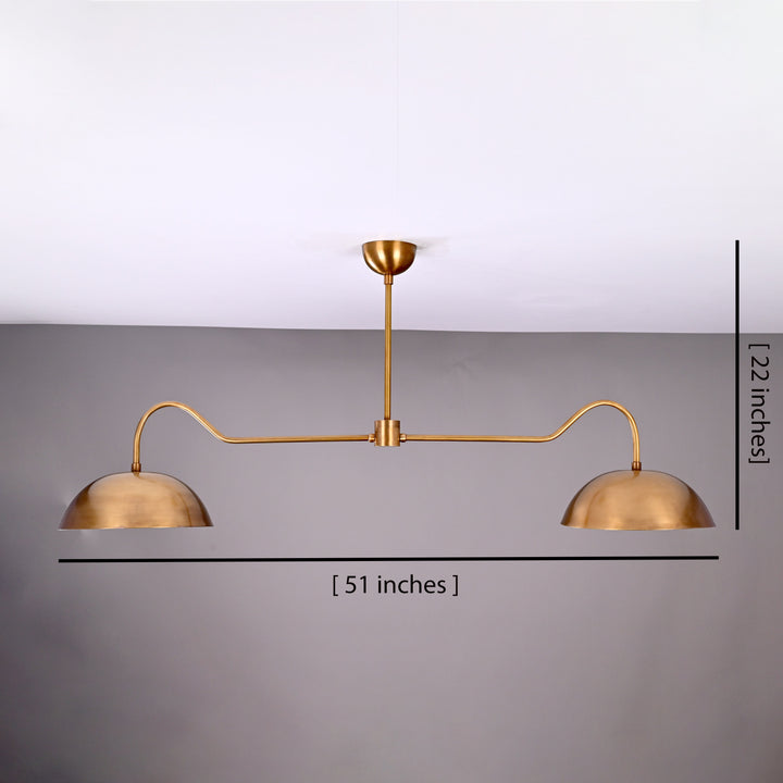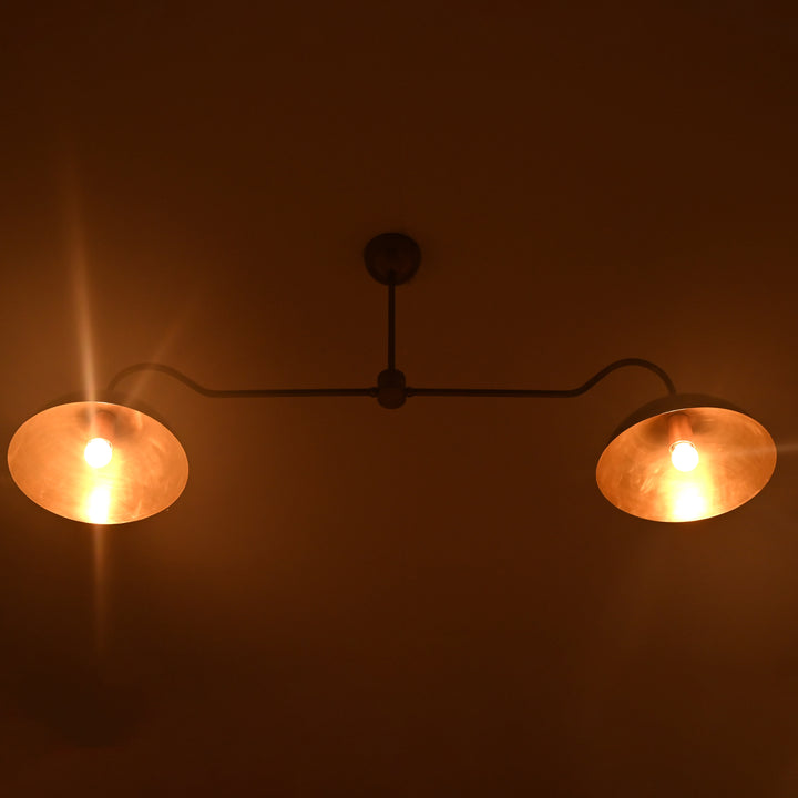 This ceiling-mounted lighting fixture features a streamlined horizontal bar supporting two symmetrical dome-shaped shades, each housing a single bulb. The fixture measures 51 inches in width and hangs 22 inches from the ceiling, making it ideal for dining or living areas that benefit from balanced, focused lighting. The structure includes a central support rod that ensures stability and visual symmetry. In a dark room, the two bulbs emit a warm, ambient glow that spreads evenly across the space, enhancing both mood and visibility. The design is sleek and modern, with subtle curves on each arm that add a refined aesthetic to its functional form. From beneath, the fixture displays a clean, circular symmetry, emphasizing its minimalist appeal.