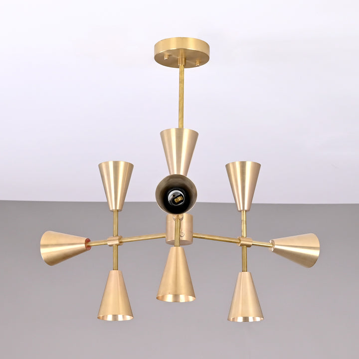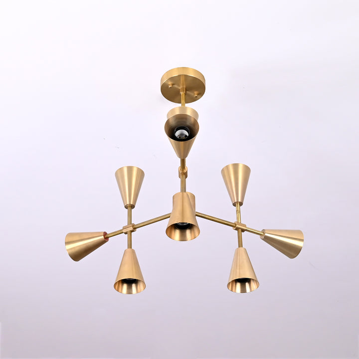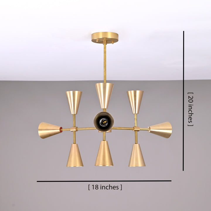 This chandelier features a striking, symmetrical structure with nine lights arranged across a three-pronged frame, creating a balanced and elegant silhouette. Each prong holds dual opposing sockets with conical shades, while a central light anchors the design. Measuring 18 inches in width and 20 inches in height, it is ideally sized for medium to large spaces. Its clean, geometric form brings a modern yet timeless look, making it a standout centerpiece. Perfect for dining rooms, living areas, entryways, or offices, it provides ample illumination while adding a strong architectural statement to any interior.