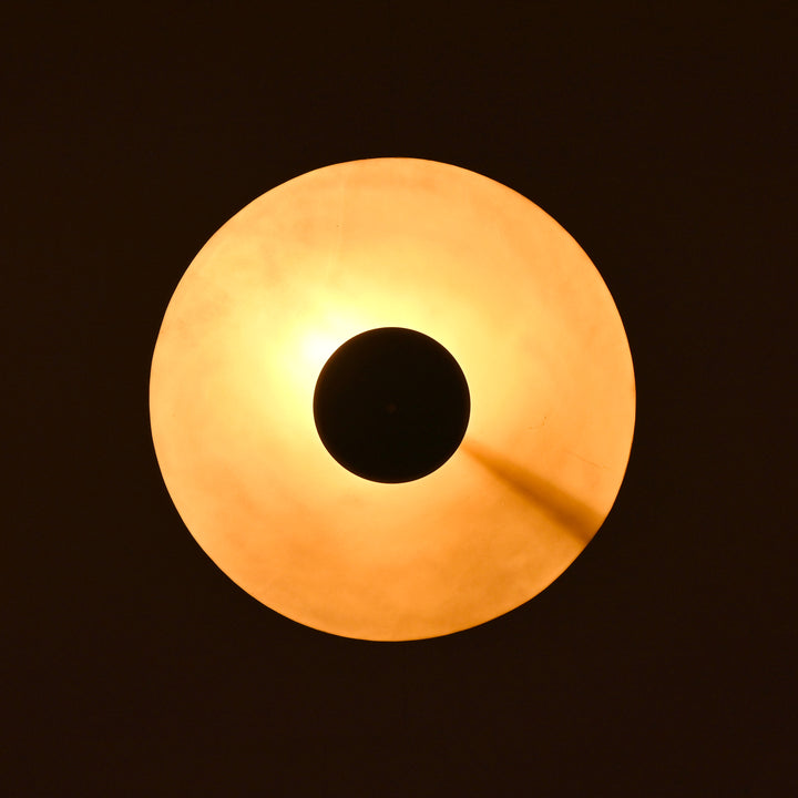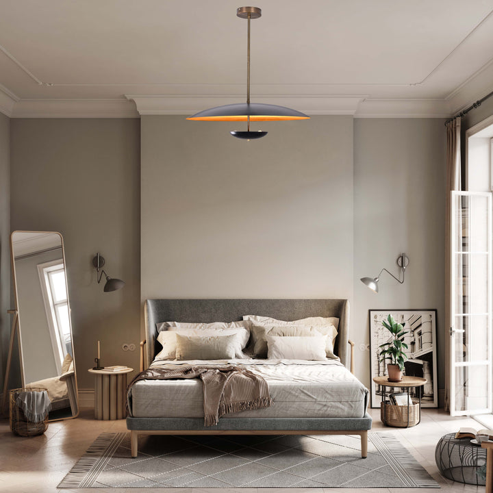 This chandelier showcases a refined structure with a central brass rod supporting two carefully spaced discs that create a balanced, floating appearance. The upper and lower discs are strategically positioned to reflect and diffuse light, enhancing the visual impact without glare. Measuring 24 inches wide and dropping 28 inches from the ceiling, it offers perfect proportions for medium to large spaces. In a dark room, the chandelier casts a warm, atmospheric glow that softly washes the ceiling and walls, adding depth and character. Designed for spaces like dining rooms, living rooms, or stylish entryways, it combines striking aesthetics with functional ambient lighting.