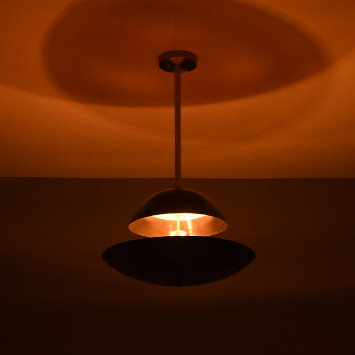 This pendant light features a distinctive structure with two opposing dome-shaped reflectors and a central decorative element that houses six bulbs, creating a balanced and sculptural form. When illuminated in a dark room, it projects a stunning eclipse-like effect on the ceiling and walls, enhancing the atmosphere with a soft, diffused glow. The upper dome subtly directs light upward, while the lower dome reflects it downward, offering a unique interplay of light and shadow. With a total height of 29 inches and a width of 18 inches, the fixture is ideal for making a striking statement in any interior space. The design beautifully merges artistic form with functional lighting, offering a dramatic visual experience even when the light is off.