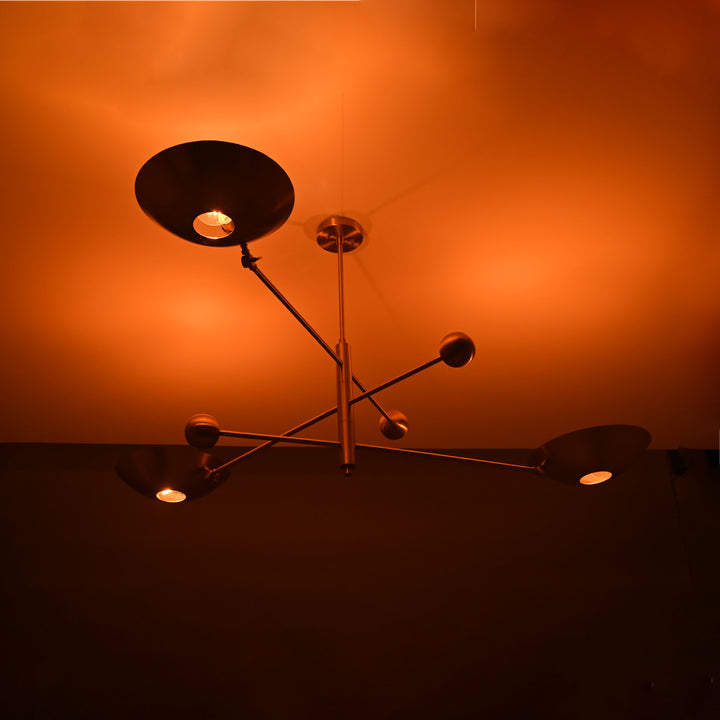 This ceiling-mounted light fixture features a structured design with three linear arms extending from a central rod, each holding a bowl-shaped shade with a cut-out center. Positioned within each bowl is a single bulb, projecting light upward and subtly diffusing it across the ceiling. The minimalist geometry gives the fixture a clean yet dynamic presence. When illuminated in a dark room, it casts a warm, ambient glow that radiates gently through the openings, creating a dramatic and cozy visual effect. The fixture measures 61 inches in width and 27 inches in height, with a central supporting rod of 12.5 mm in diameter, offering both architectural impact and ambient lighting.