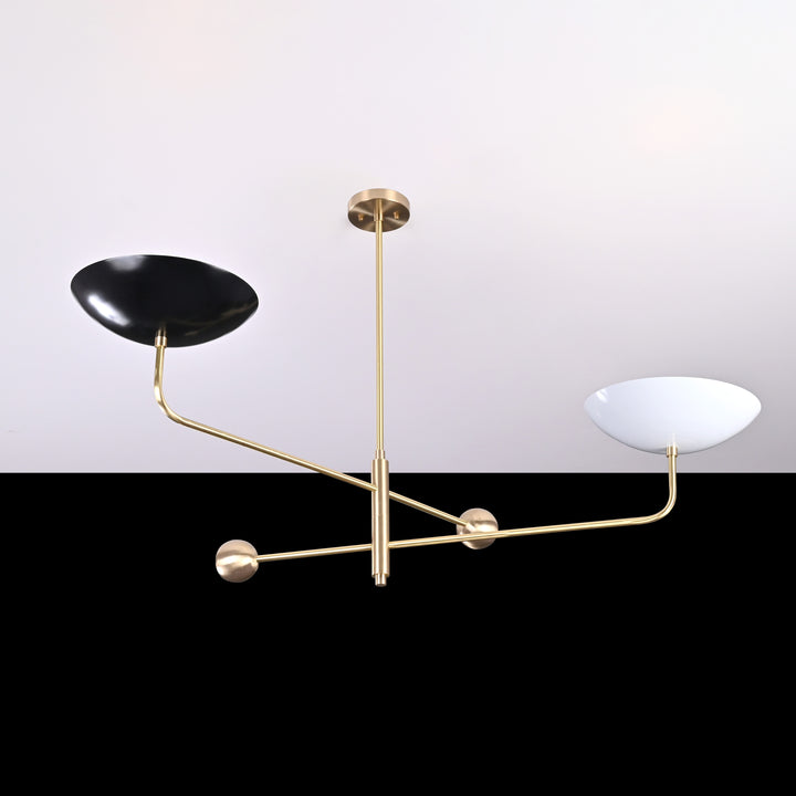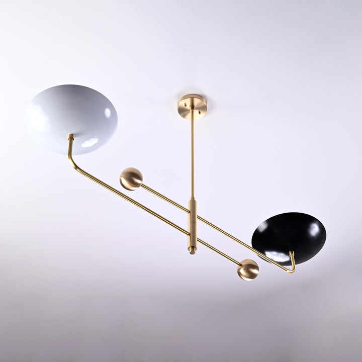 This chandelier is a striking example of minimalist design with an architectural edge. Measuring 53 inches in width and 31 inches in height, its elongated form is perfectly proportioned to make a bold statement without overwhelming the space. It features two upward-facing lights that create a soft, reflected illumination by casting light onto the ceiling. This design enhances the ambiance with a gentle, even glow that’s especially impactful in darker rooms, where the fixture's silhouette becomes more pronounced and dramatic. The structure is thoughtfully balanced with a central vertical rod supporting two horizontal arms, each ending in a shade and counterbalancing detail, giving it a weightless, floating appearance. This chandelier is ideal for adding a sense of refined elevation to modern interiors.