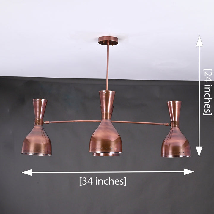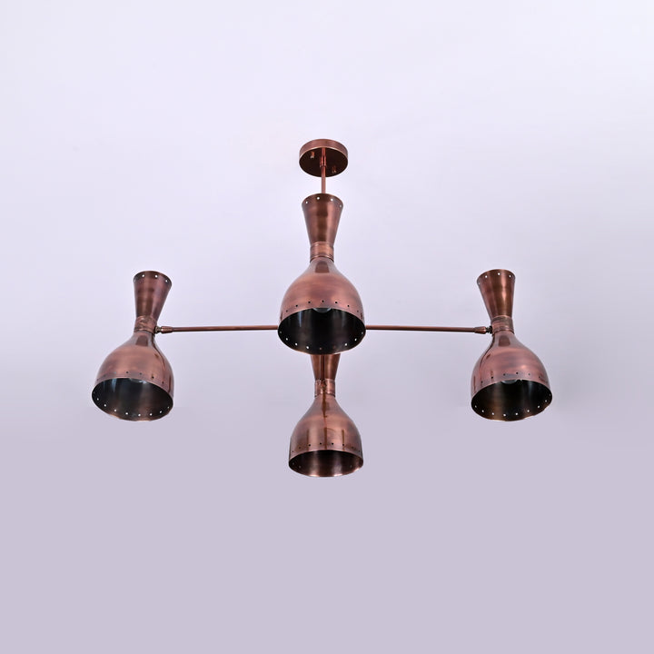 This striking Diabolo-style ceiling lamp features a bold and symmetrical four-arm structure, each arm fitted with dual light sources, providing a total of eight lights. Designed to offer a two-way illumination effect, each conical shade directs light both upward and downward, creating a balanced and ambient glow. The central vertical rod supports the horizontal arms with precision, ensuring a stable yet elegant appearance. When lit, the lamp casts a warm and diffused light that enhances the atmosphere, particularly in darker spaces, where the visual effect becomes even more dramatic and immersive. From a design standpoint, the lamp measures 34 inches in width and 24 inches in height, making it an ideal centerpiece for dining areas, lounges, or entryways. The top-down view highlights its perfectly symmetrical layout, radiating modern sophistication with a nod to mid-century aesthetics. Whether on or off, this fixture adds architectural interest and depth to any ceiling.