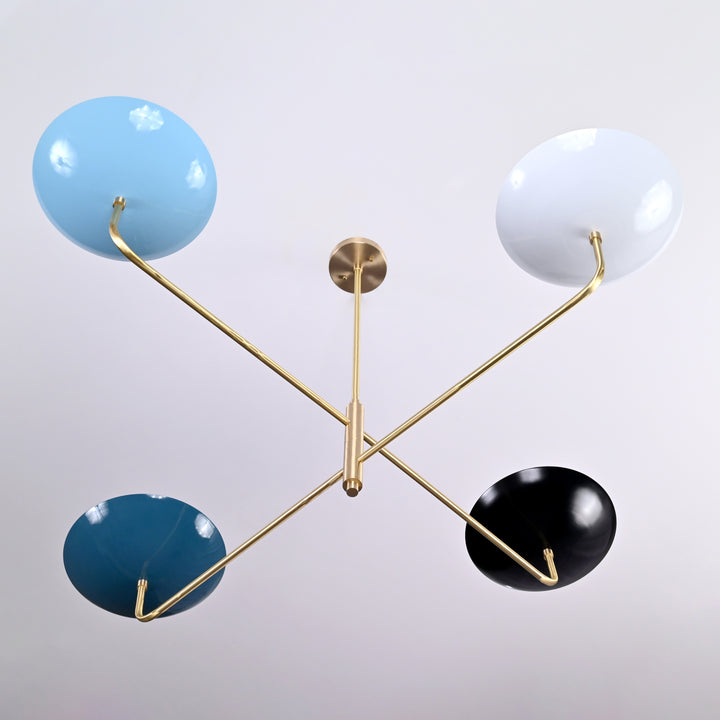 This contemporary ceiling lamp features an uplifting structure with four evenly spaced light sources, each extending from a central stem via elegantly angled arms. Designed to be a statement piece, its geometric form creates a sense of balance and motion, drawing the eye with its clean and minimalistic silhouette. Measuring 53 inches in width and 31 inches in height, the fixture is well-suited for spacious interiors, where it can serve as a focal point without overwhelming the space. When illuminated in a dark room, the lamp casts a warm, ambient glow that radiates softly from each reflector, creating an inviting and atmospheric lighting effect. The design is both functional and artistic, offering wide light coverage while maintaining a visually striking presence. Ideal for modern living rooms, dining areas, or workspaces, this piece combines structure and lighting in a seamless blend.