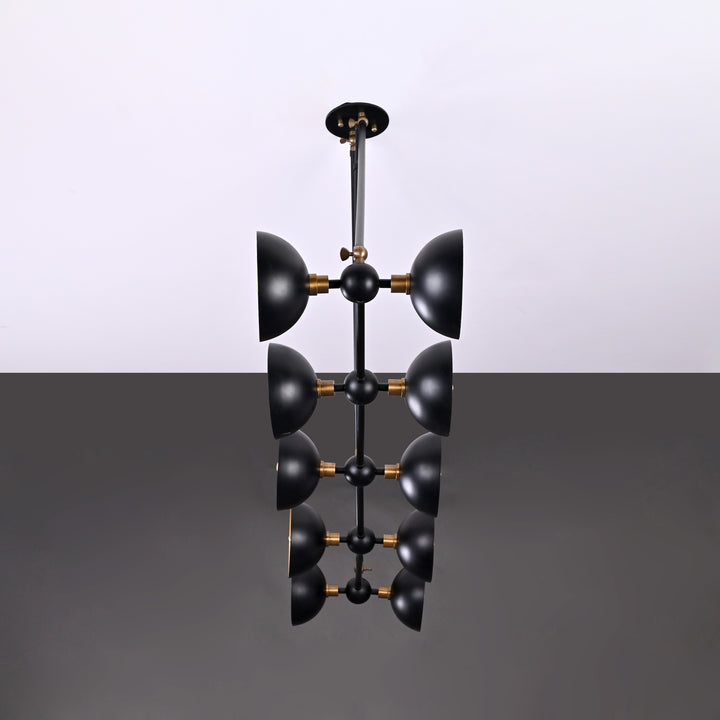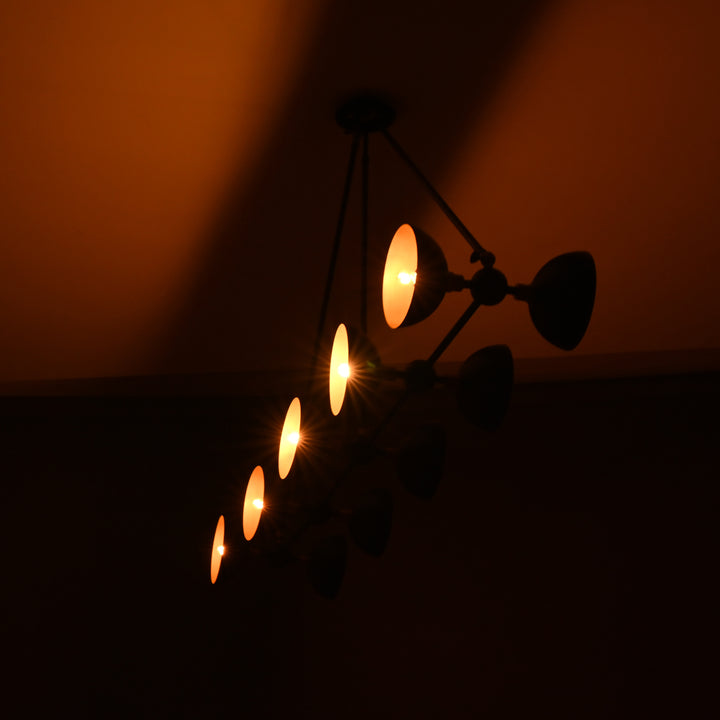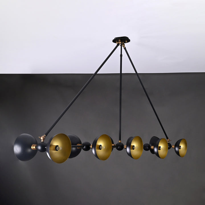 This contemporary ceiling fixture features a distinctive linear structure with a striking dual-directional lighting arrangement. Designed with a total of ten bulb holders—five on each side—the fixture directs light outward horizontally, allowing illumination to radiate toward opposite walls. This setup enhances the spatial atmosphere and creates a balanced ambient glow across the room. The design is anchored by a central rod that connects to the ceiling, supported by two angled rods that ensure structural stability and symmetry. Measuring 61 inches in width and 33 inches in height from the ceiling, it is well-suited for long dining tables, kitchen islands, or open-concept living areas. Its clean lines and geometric form contribute to a sleek, modern architectural aesthetic. The horizontally opposed lighting not only enhances visual depth but also makes it a focal point in contemporary interior settings.