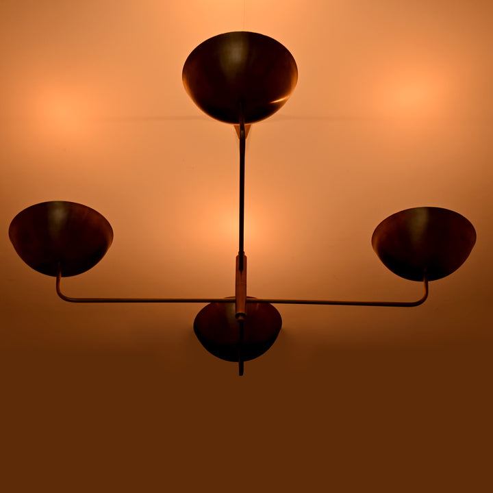 This ceiling-mounted fixture features four upward-facing bowl-shaped reflectors, each housing a single bulb. Designed to uplift light toward the ceiling, it creates a warm, ambient glow that’s especially striking in dark rooms, casting soft reflections above. The fixture spans 53 inches in width and hangs 34 inches from the ceiling, supported by a central rod with a 12.5 mm diameter. Each bowl measures 12 inches across, providing balanced illumination and visual symmetry. Its clean structure and ambient lighting effect make it ideal for enhancing modern interiors with subtle drama.