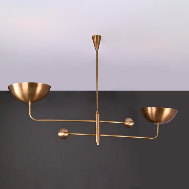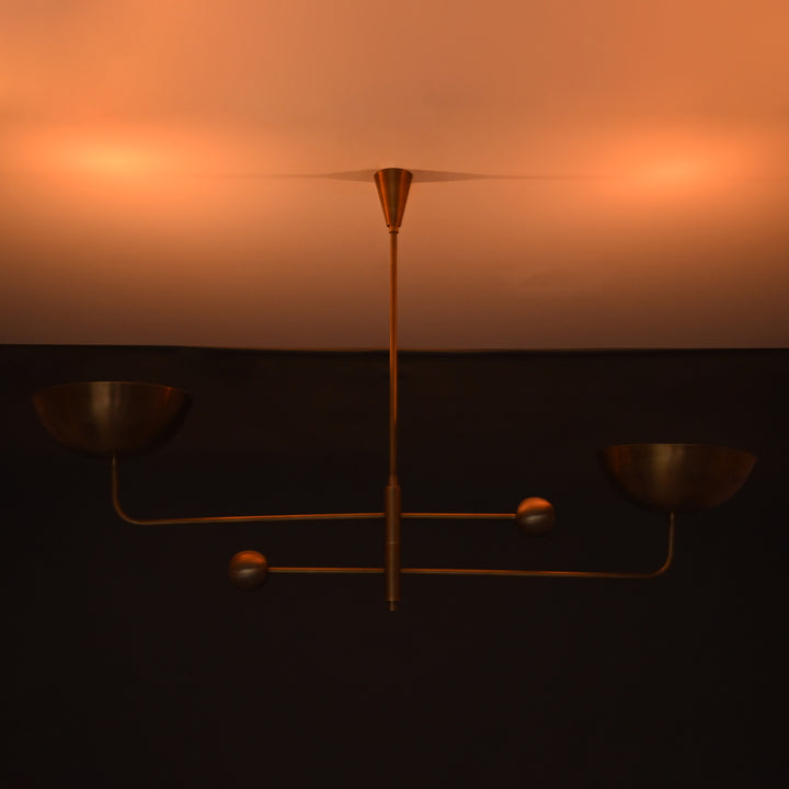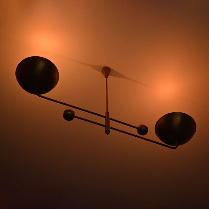 This ceiling light fixture features a sophisticated and balanced design, with two upward-facing bowl shades mounted on either side of a central rod. The structure comprises two light sources, each housed within a bowl that gently reflects the light upwards, creating a warm and ambient glow. The design is symmetrical, with each bowl extending from a horizontal bar anchored by a central vertical stem. When illuminated in a dark room, the fixture casts a stunning visual effect, with soft circular gradients of light radiating from each bowl, adding both mood and dimension to the space. The fixture measures 53 inches in total width and hangs 34 inches from the ceiling, contributing to the overall minimalist and modern aesthetic. This piece is ideal for dining areas, living rooms, or any space where both form and atmospheric lighting are valued.