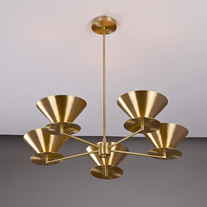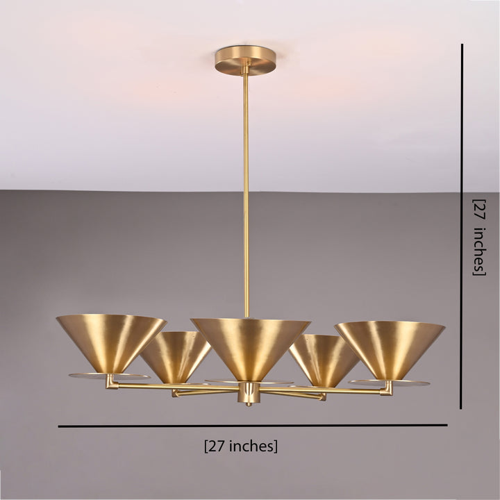 This contemporary ceiling light features a refined, symmetrical structure with five upward-facing conical shades arranged in a radial design. Crafted to provide both visual appeal and effective illumination, it creates an inviting atmosphere with its upward light direction. When placed in a dark room, the fixture casts a soft, ambient glow across the ceiling, highlighting its sculptural silhouette and enhancing the mood of the space. The evenly spaced arms support each shade, ensuring balanced light distribution and a harmonious aesthetic. Measuring 27 inches in both height and width, it is perfectly sized for medium to large spaces like living rooms, dining areas, or entryways. The design is minimal yet impactful, offering a sophisticated presence without overwhelming the room. This piece blends seamlessly with various interiors while delivering uplifting, warm light from five strategically placed bulbs.