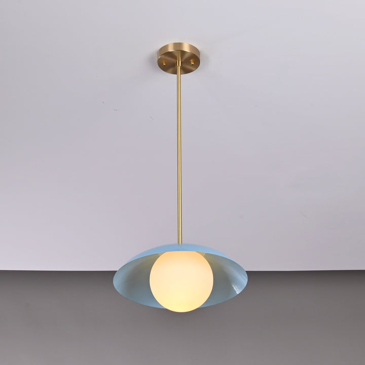 This modern pendant light features a sleek, minimalistic design with a semi-spherical shade that creates a striking visual presence from every angle. At the center, a smooth rounded diffuser is nestled within the shade, distributing light evenly for a soft and ambient glow. The internal globe enhances the overall light output, making it suitable for various settings such as dining areas, kitchens, or entryways. The pendant is supported by a streamlined brass rod structure that ensures a clean and stable suspension. With a diameter of 12 inches and a total height of 27 inches from ceiling to base, the fixture is well-proportioned for both single and grouped installations. Its sculptural form adds a touch of sophistication and modern elegance to any space.