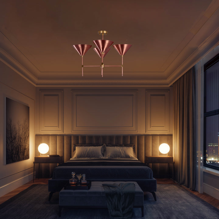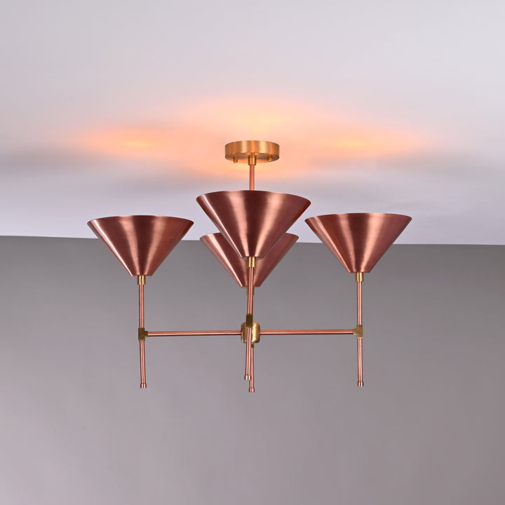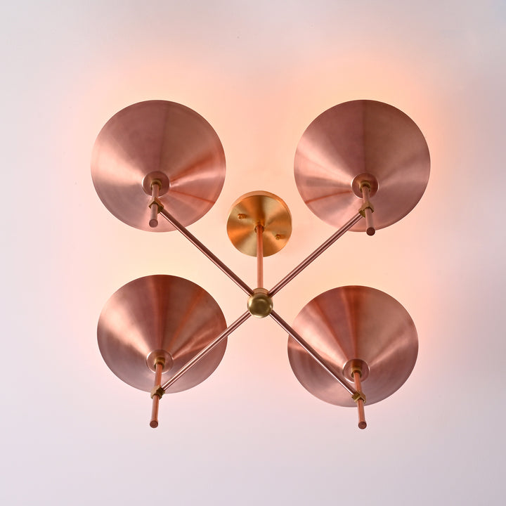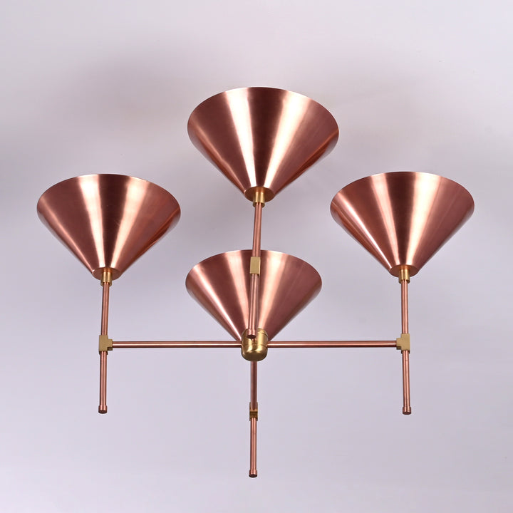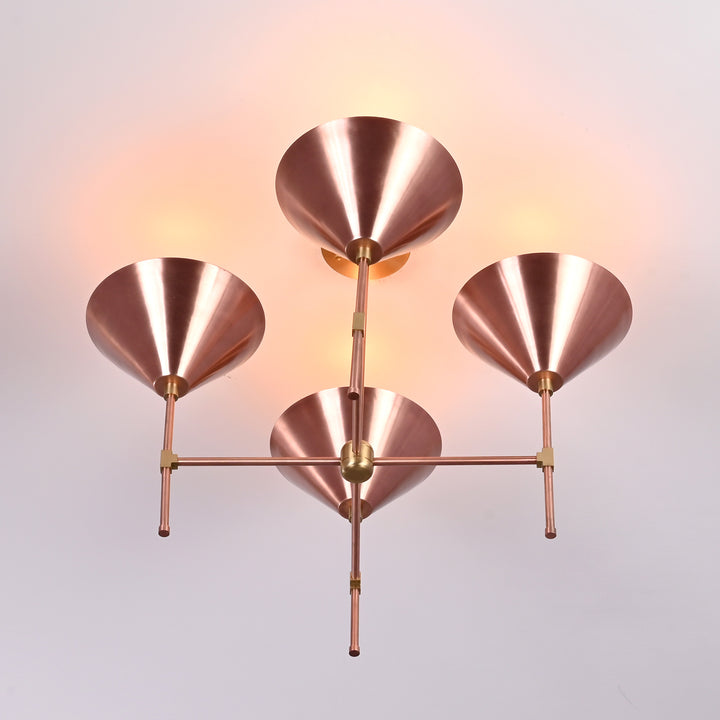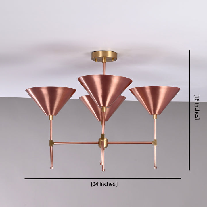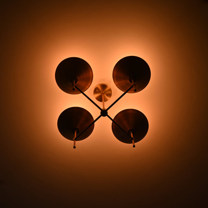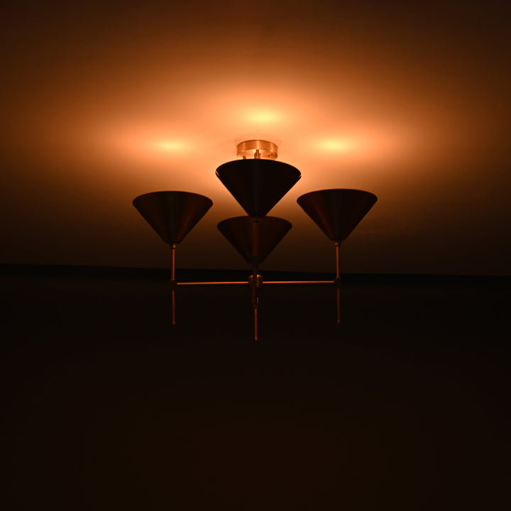 This ceiling-mounted light fixture features a striking geometric design with four symmetrically placed conical shades arranged in an intersecting X-pattern. It offers a bold, sculptural silhouette with a structured frame and clean vertical support connecting it to the ceiling plate. Measuring 24 inches in width and 18 inches in height, it is proportioned to complement both compact and spacious interiors. The fixture houses four bulbs that emit a warm, upward glow, creating a soft, ambient light that reflects beautifully off the ceiling. In a dark room, the fixture casts an elegant wash of light, enhancing the architectural interest of the space while maintaining a cozy, atmospheric effect. This lighting piece is ideal for living areas, dining spaces, or entryways where both form and function are essential.
