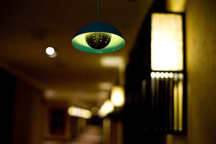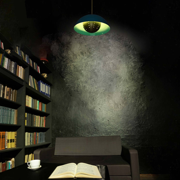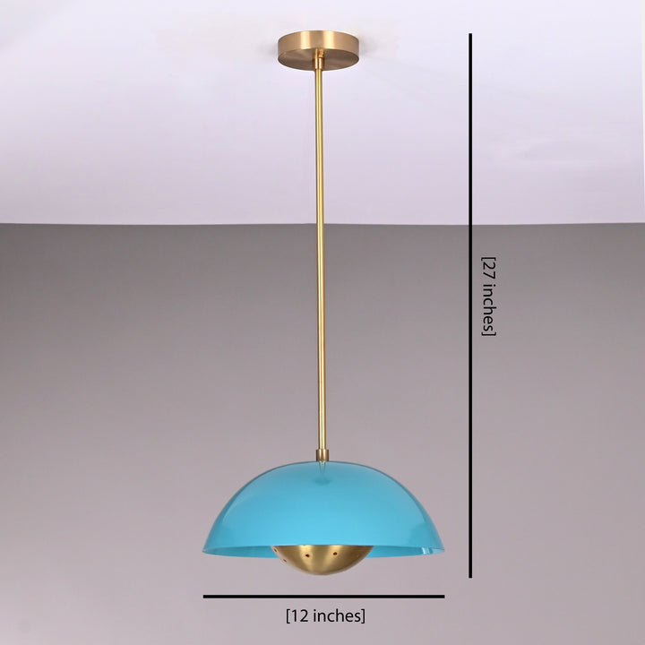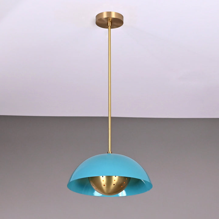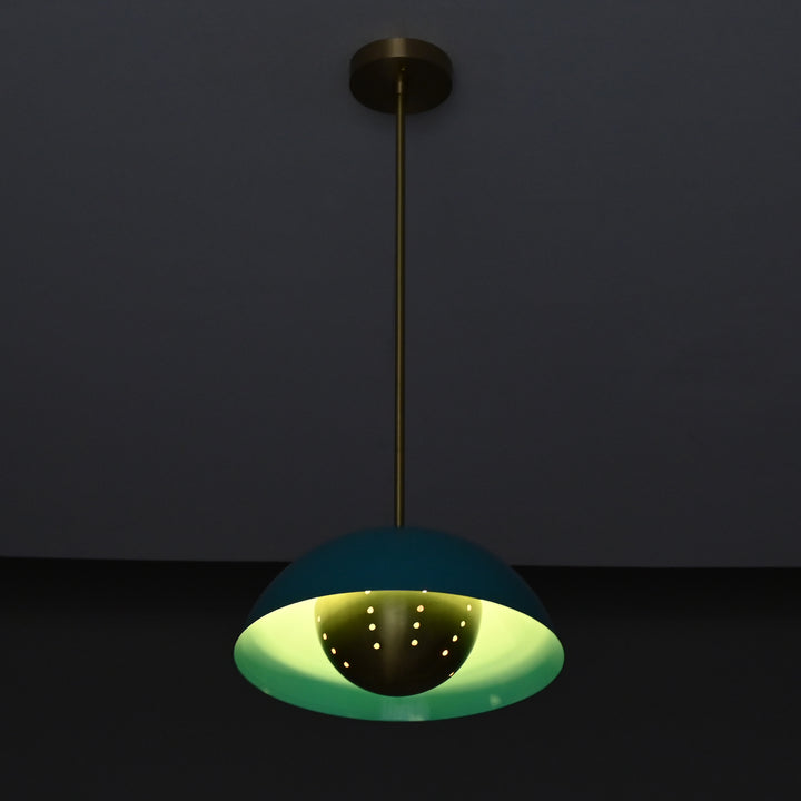 This pendant light features a sleek and symmetrical dome design with a distinctive inner hemisphere housing two light sources. The perforated inner dome enhances the glow by diffusing light softly through the small circular holes, creating a subtle star-like effect. It measures 12 inches in diameter and hangs 27 inches from the ceiling, making it ideal for compact to medium-sized spaces. When illuminated in a dark room, the light transforms the ambiance with a warm, focused glow that highlights the structural beauty of the fixture while casting an elegant play of shadows. The dual-bulb setup ensures ample brightness, effectively balancing both direct and ambient lighting. Whether viewed from below or from a distance, the pendant maintains its refined profile and visual interest, making it both functional and aesthetically appealing.