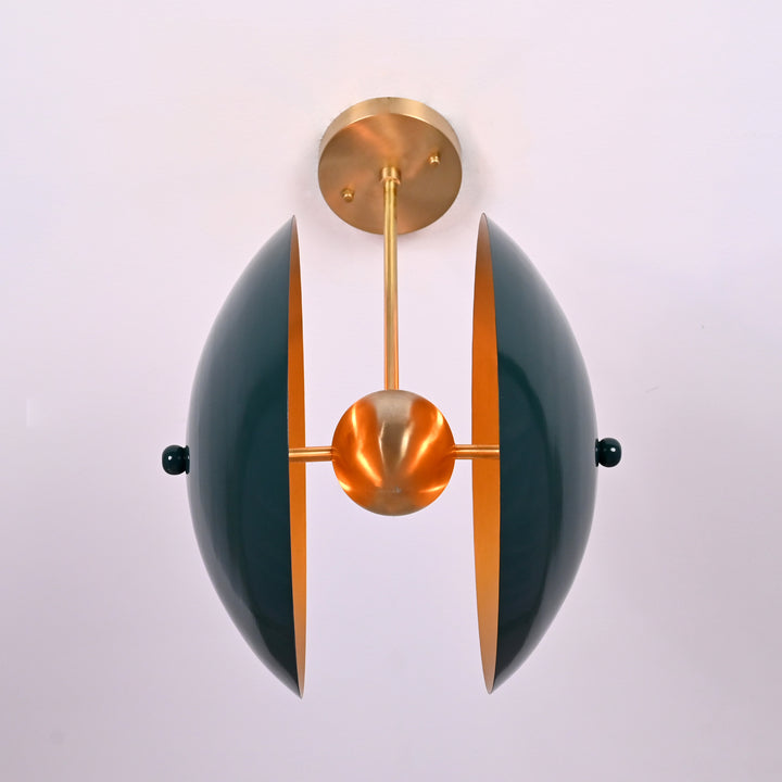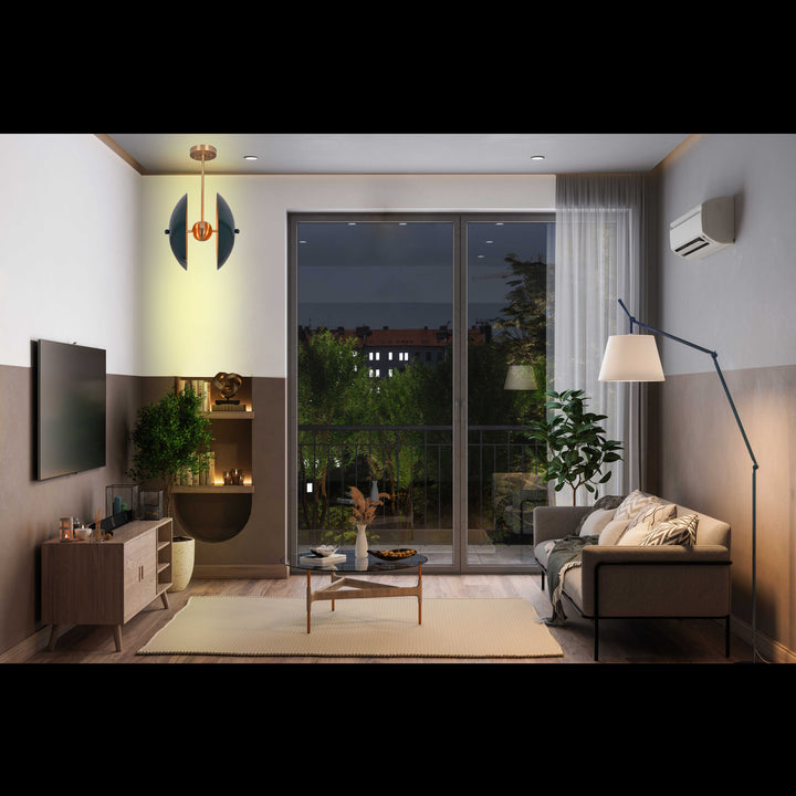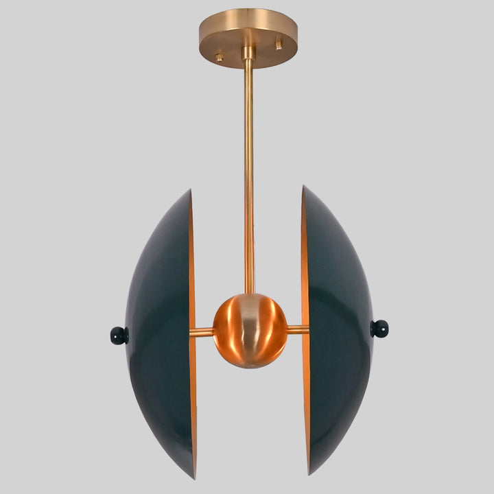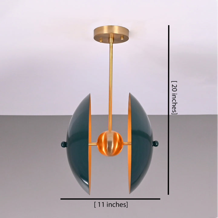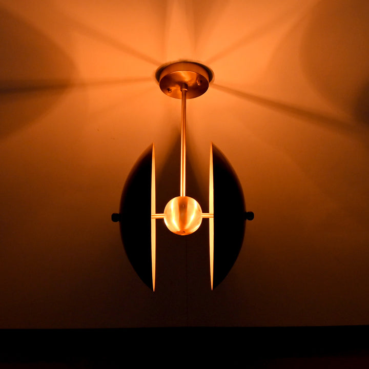 This ceiling pendant light features a striking and modern sculptural design that makes a bold statement in any interior setting. It measures 20 inches in height and 11 inches in width, creating a compact yet impactful visual presence. The structure consists of a central sphere from which six bulb sockets extend, strategically positioned to ensure balanced illumination. The outer shell is split vertically into two hemispherical forms that frame the inner globe, allowing light to escape through the open slits and bounce off surrounding surfaces. When lit in a dark room, the fixture creates a captivating ambient effect with dynamic shadows and radial light patterns that spread across the ceiling and walls, enhancing the atmosphere with a dramatic glow. The interplay of light and shape emphasizes the geometric design, making it ideal for modern or artistic spaces where visual interest is key. This pendant is both a lighting solution and a conversation piece, merging functionality with a bold design language.