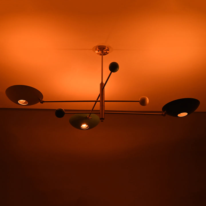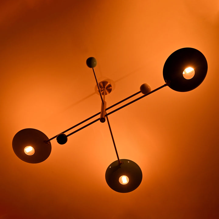 This ceiling-mounted light fixture features a structured design with three linear arms extending from a central rod, each holding a bowl-shaped shade with a cut-out center. Positioned within each bowl is a single bulb, projecting light upward and subtly diffusing it across the ceiling. The minimalist geometry gives the fixture a clean yet dynamic presence. When illuminated in a dark room, it casts a warm, ambient glow that radiates gently through the openings, creating a dramatic and cozy visual effect. The fixture measures 61 inches in width and 27 inches in height, with a central supporting rod of 12.5 mm in diameter, offering both architectural impact and ambient lighting.