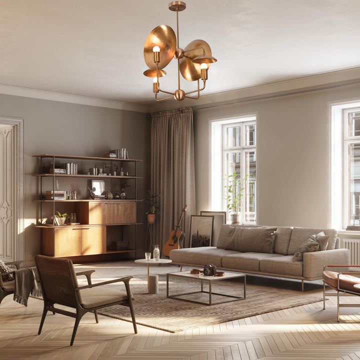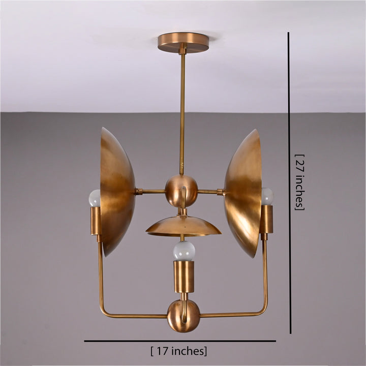 This ceiling light fixture features a unique, geometric design with four evenly spaced bulb holders arranged around a central sphere. It integrates curved, dish-like reflectors behind each bulb to enhance light distribution and visual interest. The structure is supported by a single vertical rod attached to a ceiling mount, ensuring a balanced and sturdy installation. Measuring 27 inches in height and 17 inches in width, this light is ideal for mid-sized to large rooms. When illuminated in a dark room, it casts dramatic, artistic shadows and a warm ambient glow that enhances the atmosphere. The layout ensures that the light is distributed evenly while also creating a striking visual effect. Its contemporary structure blends modern aesthetics with functional lighting, making it a statement piece.
