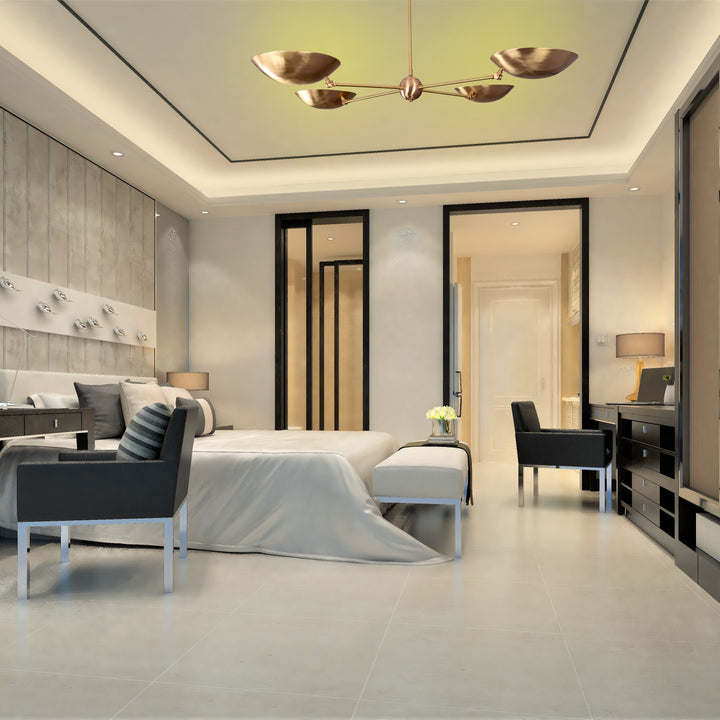 This modern ceiling light features a striking four-arm structure, each arm extending outwards from a central spherical hub to hold a large bowl-shaped shade. Designed to hold four individual bulbs, the fixture provides ample illumination that radiates upward, reflecting softly off the ceiling to create a warm, diffused glow. The wide span of 57 inches and a height drop of 24 inches ensures broad light distribution, making it a focal point in any space. When lit in a dark room, the fixture casts an ambient, atmospheric effect that enhances the mood with a subtle, elegant presence. The upward-facing bowls direct light gently across the ceiling, eliminating harsh glare and providing balanced brightness. The architectural symmetry of the arms adds a refined, contemporary aesthetic. Ideal for dining rooms, living spaces, or entryways, it blends sculptural form with practical lighting. Its clean lines and minimalist appeal make it versatile for various interior styles.