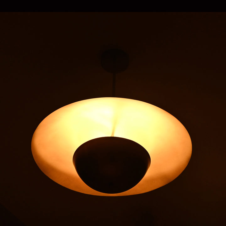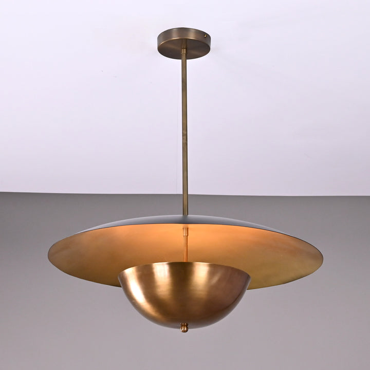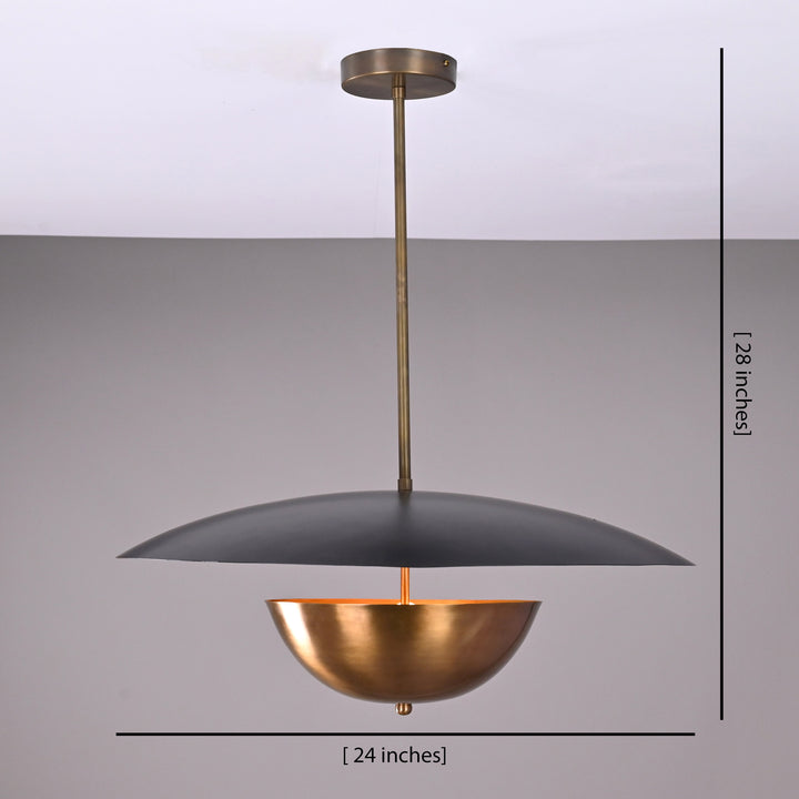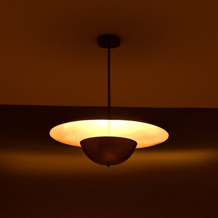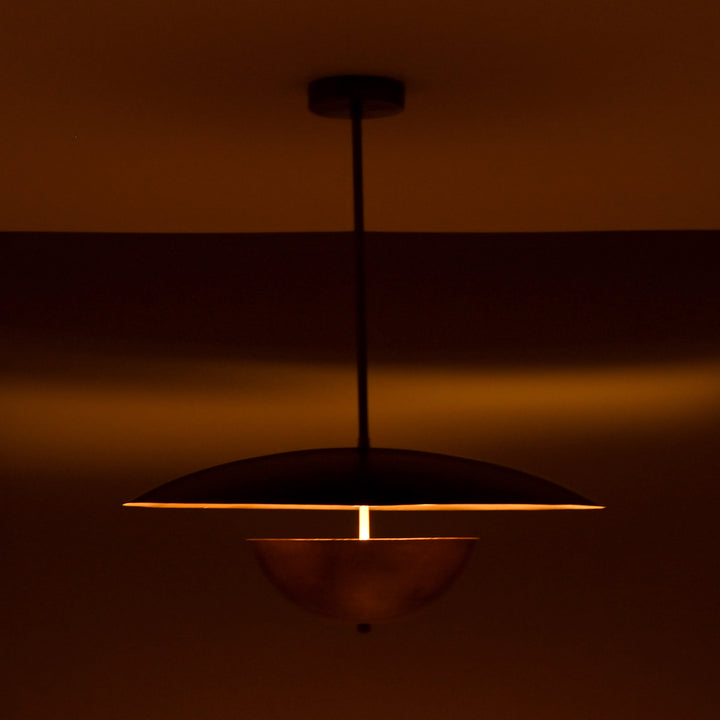 This pendant light showcases a sculptural, dual-dome design suspended from a sleek central rod, creating a striking visual silhouette. With a diameter of 24 inches and a total height of 28 inches, it is proportioned to suit dining areas, entryways, or lounge spaces. The fixture houses three bulbs strategically positioned to distribute light evenly. Its unique structure directs illumination both upward and downward, producing a warm, ambient effect that becomes especially dramatic in a dark room. When lit, the upper shade reflects a soft halo onto the ceiling, while the lower dome glows gently, enhancing the room’s mood. From below, the concentric shapes create a clean and modern aesthetic. In low light, it offers a subtle interplay of brightness and shadow, enriching the atmosphere without glare. This piece blends architectural form with practical lighting performance.