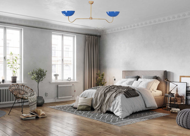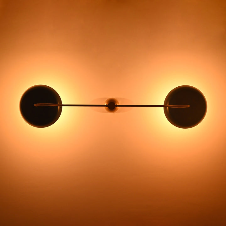 Designed with a sleek, suspended structure, this ceiling light features two upward-facing bowls that deliver an elegant balance of form and function. Measuring 51 inches in width and extending 18 inches from the ceiling, the design showcases a clean, minimal profile with a gentle curvature in its arms. It accommodates two bulbs, providing soft, uplifting illumination that reflects off the ceiling, enhancing ambient lighting. In a dark room, the fixture creates a warm and even glow with a visually striking halo effect above each bowl, contributing to a cozy and elegant atmosphere.