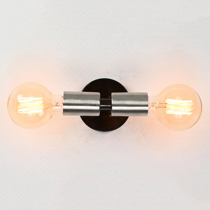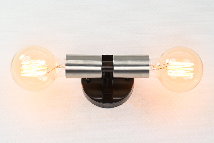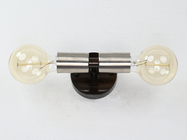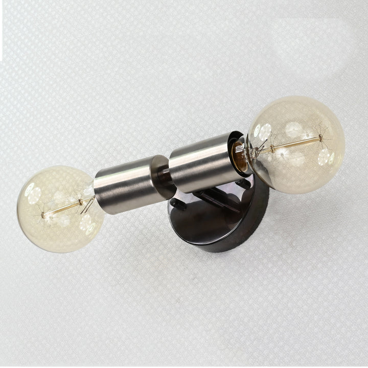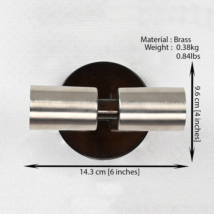 This vertical two-light wall sconce is a refined blend of industrial strength and minimalist geometry. Constructed from solid brass and finished with a brushed nickel tone over a dark patina base, the fixture stands at 14.3 cm (6 inches) in height and 9.6 cm (4 inches) in width. Two cylindrical sockets—positioned above and below a central rod—offer a balanced design that delivers upward and downward illumination, perfect for mood or accent lighting. Despite its compact profile and lightweight build (0.38 kg / 0.84 lbs), the fixture offers substantial visual presence. Ideal for flanking mirrors, highlighting hallways, or creating vertical rhythm on accent walls, it brings clean lines and a subtle contrast of finishes. Pair with Edison bulbs for a vintage look or frosted globes for a soft, contemporary glow.