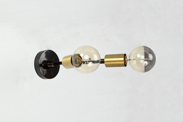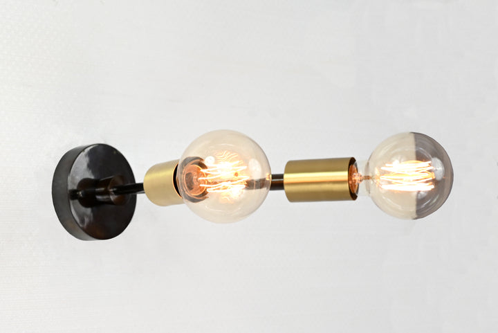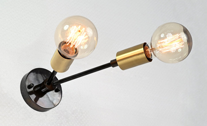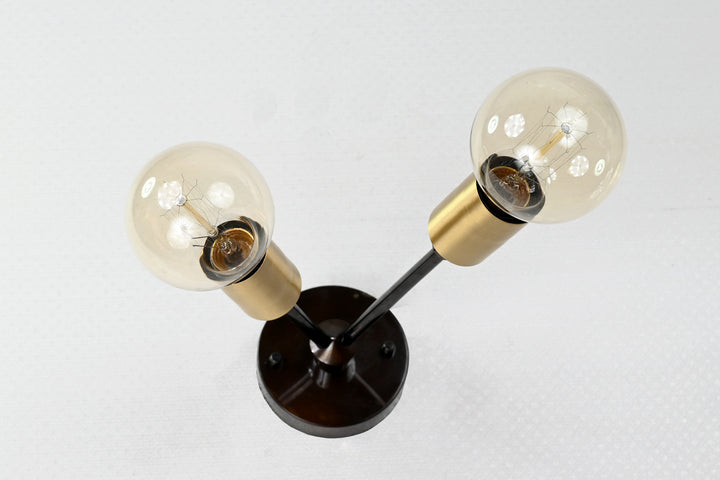 This sleek, dual-headed wall sconce is crafted from solid brass, featuring a distinctive two-tone finish that fuses matte black and brushed gold. With its clean lines and upward-angled arms, it brings a refined industrial edge to any space. Measuring 26.7 cm (10.5 inches) in height and 19 cm (7.4 inches) in width, it’s compact yet visually striking. Ideal for accent lighting in hallways, bedrooms, or modern office settings, this fixture accommodates two exposed filament bulbs to cast a warm, inviting glow. Lightweight at just 0.45 kg (1 lb), it's easy to install and adds character without overwhelming your wall space.