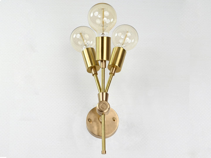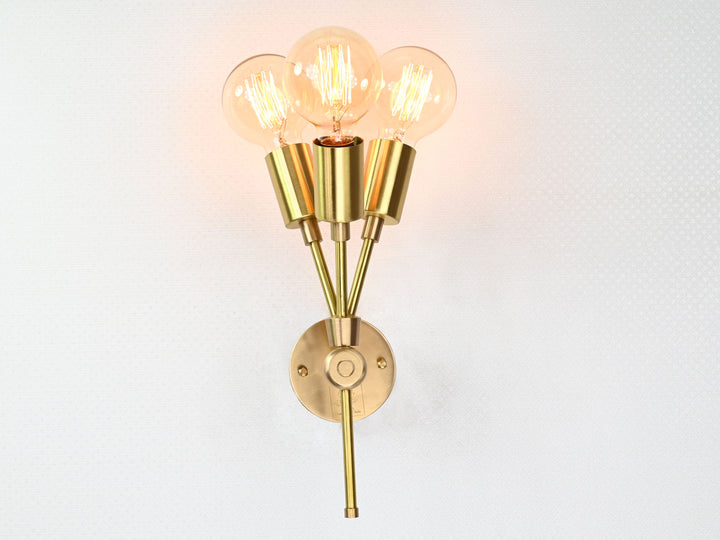 This sophisticated 3-light wall sconce, meticulously crafted from high-quality brass, is a statement piece that merges both elegance and functionality. With a warm, brushed gold finish and clean cylindrical socket holders, the design adds a radiant yet subtle touch to any interior. The sconce features three arms arranged in a fanned composition, radiating symmetrically from a central brass hub that anchors the design in geometric harmony. Its overall dimensions — 31.4 cm in height and 9.6 cm in width — offer a tall and slender profile that complements narrow wall spaces or acts as a bold vertical feature in wider compositions. Perfect for modern interiors, transitional décors, or even vintage-inspired settings, this piece is ideal for flanking mirrors, accentuating entryways, or adding architectural lighting to hallways. The exposed bulb design enhances the glow, while the open structure ensures full luminosity and maximum impact. Weighing 0.756 kg (1.68 lbs), it strikes the perfect balance between durability and minimal visual weight.