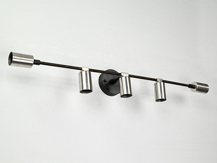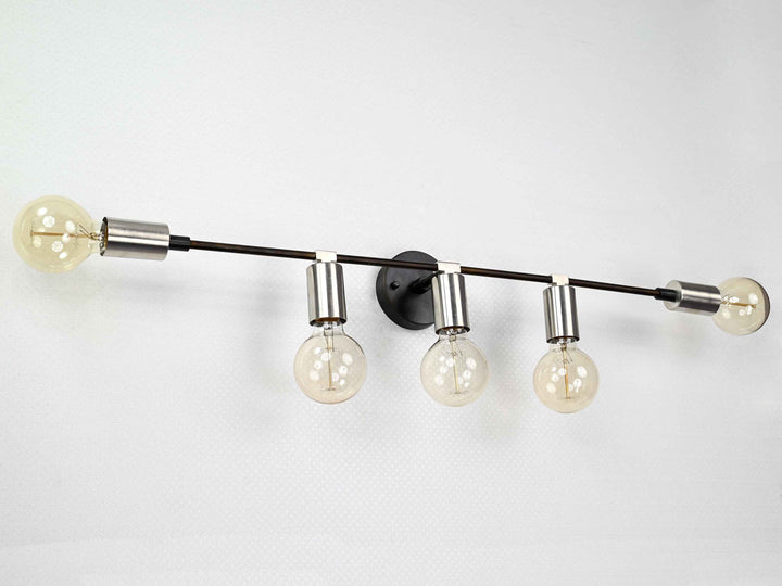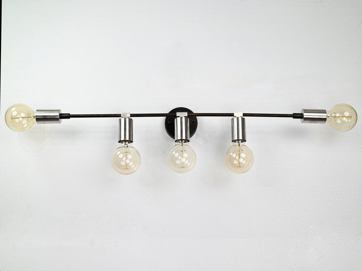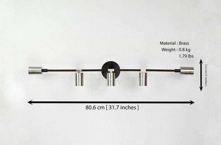 Exuding a sense of modern industrial elegance, this five-light brass wall fixture is a masterful blend of craftsmanship and minimalism. Constructed entirely from premium-grade brass and finished with brushed silver cylindrical holders, the piece offers a striking contrast against its matte black rod and wall plate. Measuring 80.6 cm (31.7 inches) in width and 12.5 cm (5 inches) in height, this lightweight fixture (0.8 kg / 1.79 lbs) is designed for effortless wall mounting and visual impact. Its evenly spaced sockets are tailored to showcase exposed filament or globe-style bulbs, casting a warm and ambient glow perfect for creating a sophisticated atmosphere. Ideal for accentuating contemporary lofts, modern studios, vanity mirrors, or gallery walls, it provides both symmetry and style. When styled above artwork or as a horizontal sconce over a console or headboard, it elevates the aesthetic while offering balanced illumination. Its linear form makes it a natural choice for elongated spaces, where its sleek profile and metallic tones bring cohesion and refinement. Pair with matte black or chrome décor for a curated, urban finish.