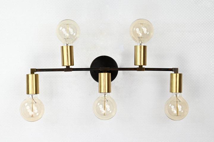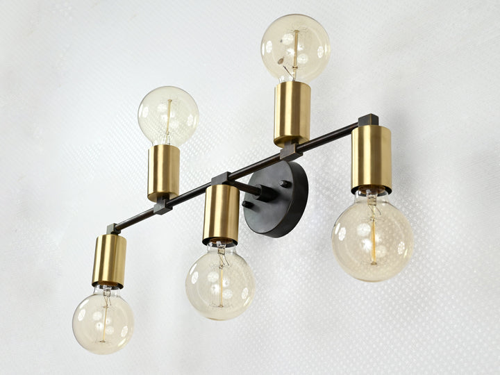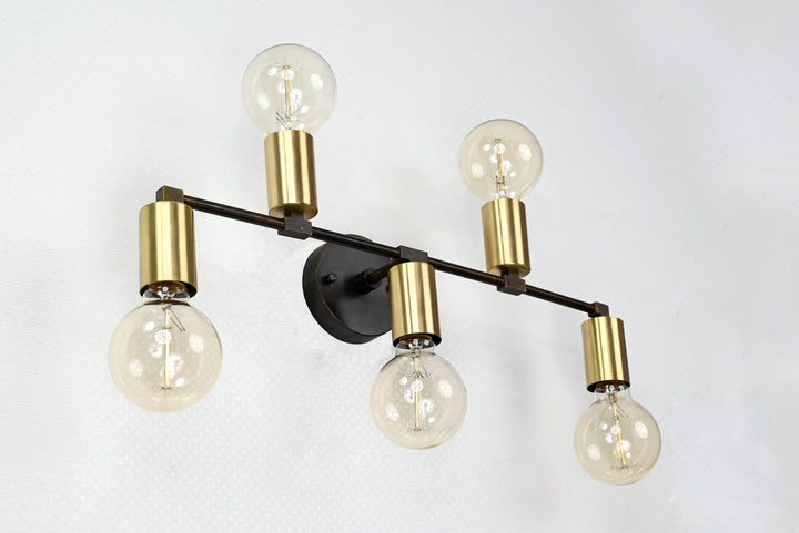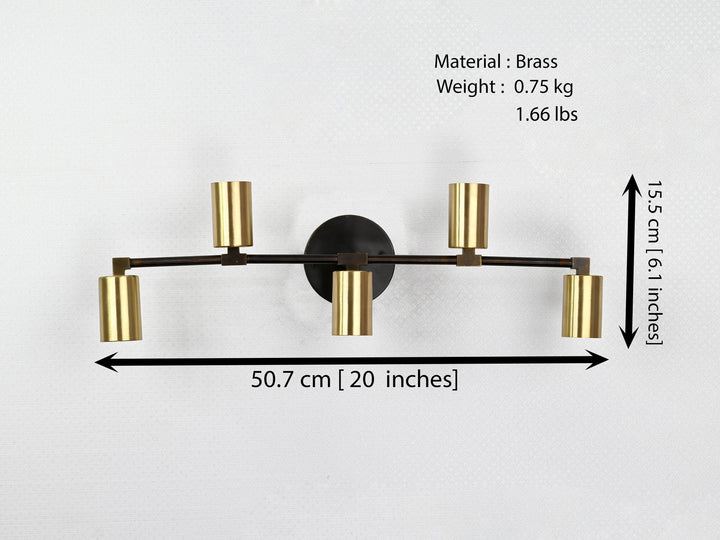 Crafted from premium-quality brass, this six-light wall fixture exemplifies superior craftsmanship and intentional design. Measuring 50.7 cm (20 inches) in width and 15.5 cm (6.1 inches) in height, the piece maintains a balanced yet dynamic presence that suits both compact and expansive interiors. The bold juxtaposition of matte black framework with polished brass cylindrical bulb holders elevates its visual appeal, creating a captivating contrast that effortlessly blends industrial precision with contemporary finesse. Designed to accommodate exposed filament bulbs, this fixture provides ambient, warm illumination that enhances both functionality and mood. Ideal for use above bathroom vanities, in hallways, or accenting living room feature walls, its linear silhouette ensures even light distribution while retaining visual elegance. This piece pairs beautifully with minimalist decor, Scandinavian-inspired layouts, or industrial-chic environments. Position it horizontally or vertically depending on the aesthetic direction of your space—it serves as both a lighting solution and a statement-making design element. Its modular geometry and dual-finish detailing make it a timeless addition to modern interiors.