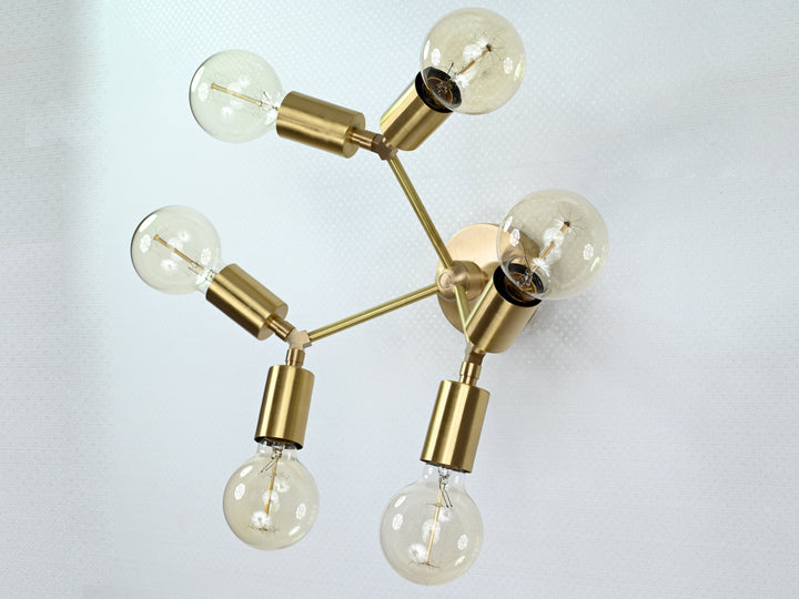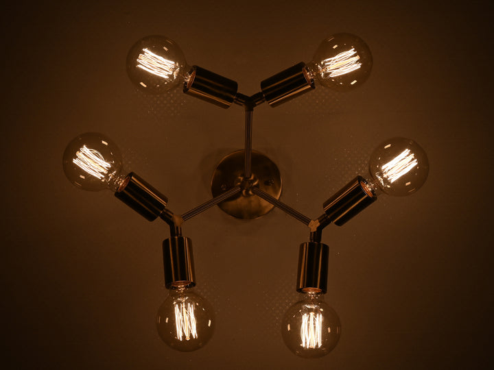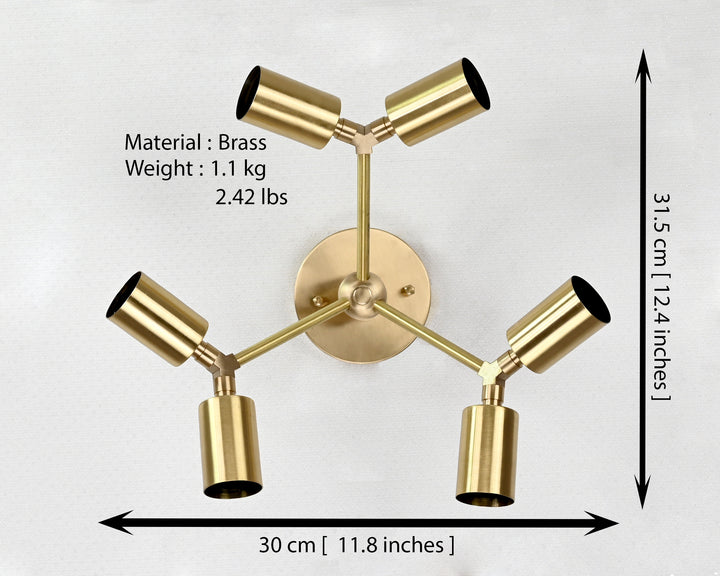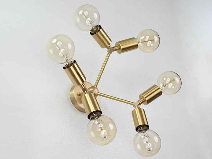 Make a dramatic statement with this sculptural six-light brass wall sconce, designed to infuse your space with warm, contemporary elegance. Measuring 12.4 inches in height and 11.8 inches in width, this standout piece showcases a dynamic arrangement of six angled sockets radiating from a central hub. Crafted entirely from high-quality brass with a smooth, brushed finish, it offers both durability and visual sophistication. Ideal for larger spaces or as a bold focal point, this fixture is perfect for living rooms, creative studios, dining areas, or modern entryways. Whether you opt for vintage Edison bulbs or minimalist LEDs, the open socket design invites you to personalize the look and ambiance. Each angle and arm is meticulously crafted to balance symmetry with movement, creating an eye-catching structure that doubles as illuminated art.
