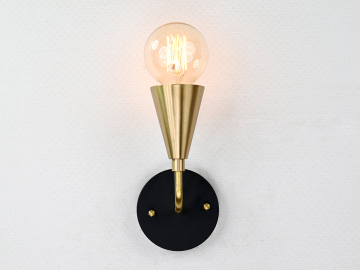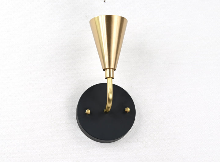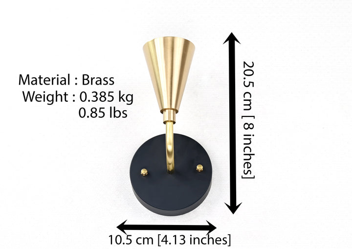 Add a touch of timeless contrast to your space with this handcrafted brass wall sconce, showcasing a sleek cone shade mounted on a bold black circular backplate. Standing 8 inches tall and 4.13 inches wide, this compact yet impactful fixture is perfect for accent lighting in modern hallways, vanities, or cozy reading nooks. The warm tone of brushed brass paired with the matte black finish creates a high-end, gallery-like aesthetic. Crafted from solid brass, the design is as durable as it is visually refined. The upward-facing cone softly disperses light, creating a warm and inviting glow. Whether installed alone or in a symmetrical pair, this sconce brings sculptural elegance and minimalist drama to any wall. Its streamlined form and timeless palette make it a versatile piece for a range of interiors—from modern and mid-century to luxe and industrial.