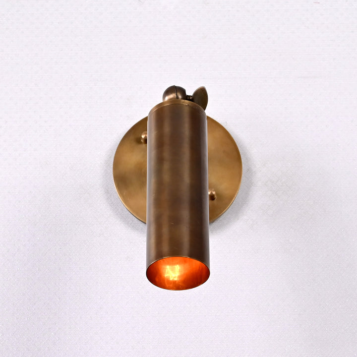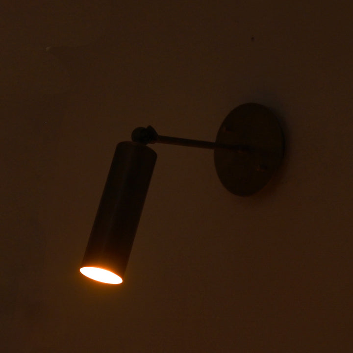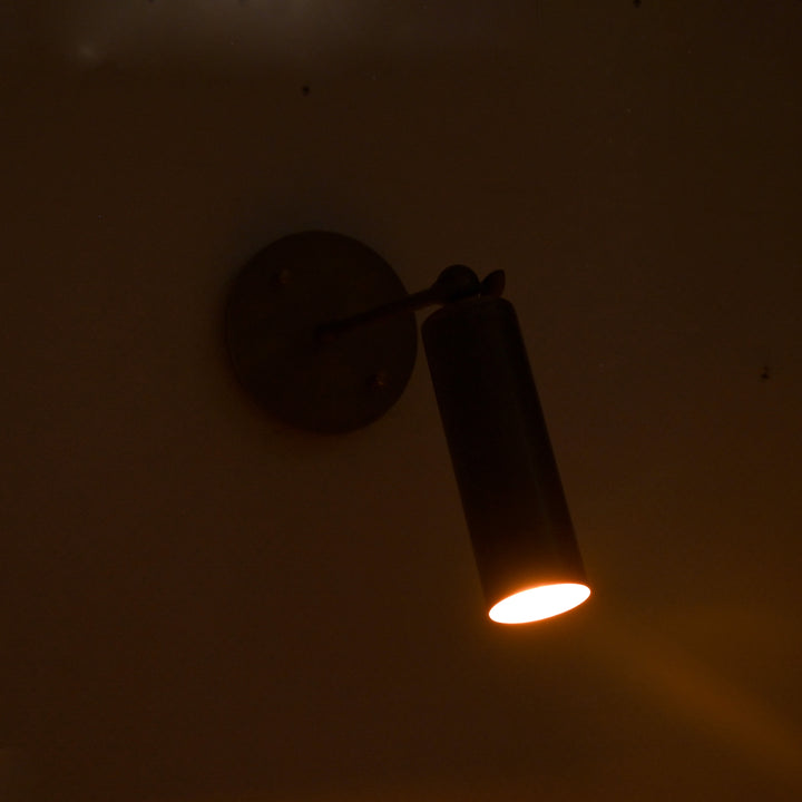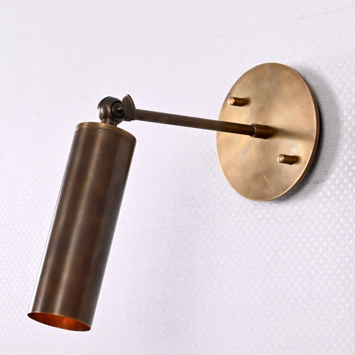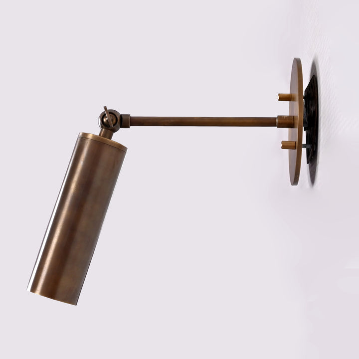 Sleek, minimal, and resolutely modern, this wall-mounted brass spotlight exemplifies purposeful design through clean geometry and utilitarian grace. Featuring a slender cylindrical shade suspended from a pivoting arm, the fixture extends 11 inches from the wall and rises 12 inches vertically—creating a poised architectural profile that blends form and function seamlessly. Crafted entirely from brass with a rich patina, the sconce projects a focused beam of light—perfect for accent lighting, task illumination, or art highlighting. Its understated yet industrial silhouette renders it equally at home in refined lofts, contemporary offices, or curated gallery walls.