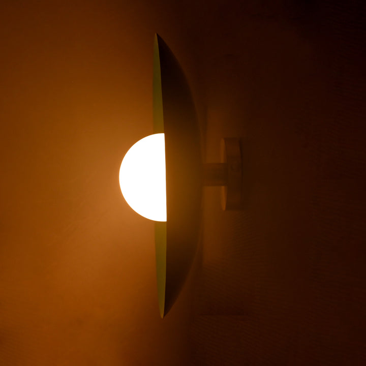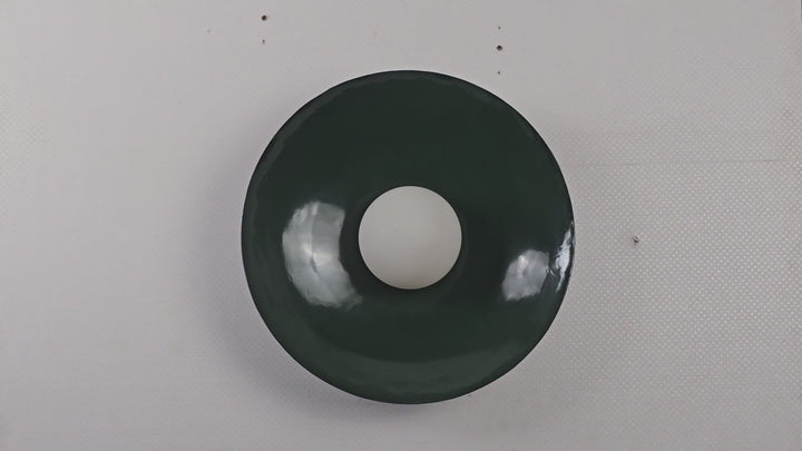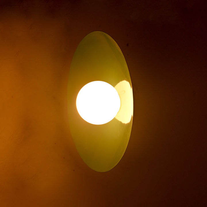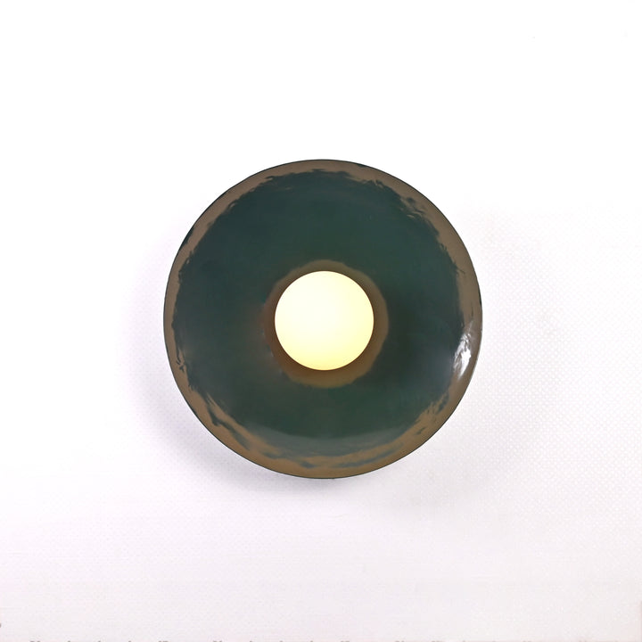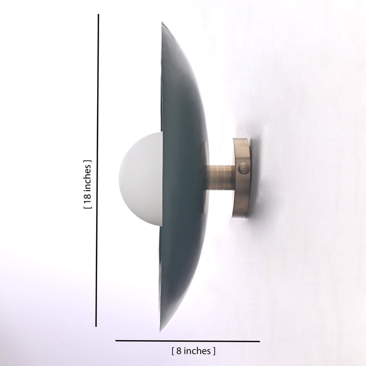A visual symphony of form and light, this striking wall sconce merges sculptural artistry with refined functionality. Crafted from lustrous brass and adorned with a rich hunter green enamel, its bold dish silhouette cradles a glowing orb of opal glass that radiates a warm, celestial ambiance. Measuring 18 inches in diameter and projecting 8 inches from the wall, this fixture transforms any surface into a dynamic lighting installation. The spherical diffuser casts soft, atmospheric illumination while the reflective concave interior creates a captivating halo effect. Minimal yet theatrical, this piece effortlessly elevates hallways, feature walls, or ambient corners, evoking a gallery-like aura wherever it resides.